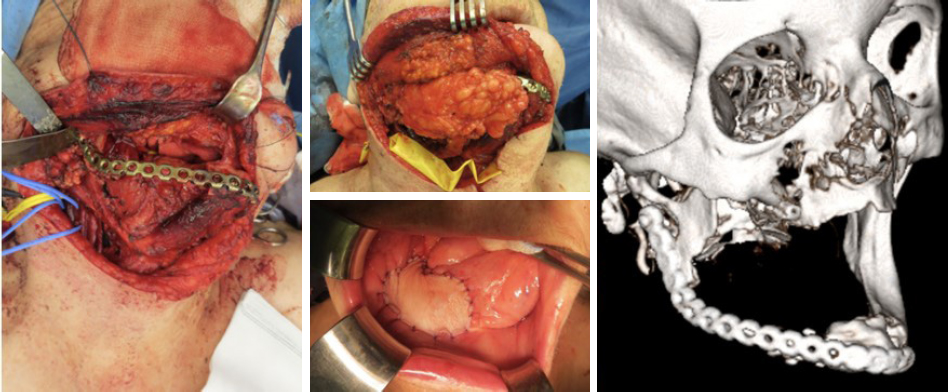 Figure 2. Intraoperative picture of the mandible reconstruction with titanium reconstruction plate (left); insetting of the RFFF using one paddle to fill the dead space over the mandible (top middle) and the other to reconstruct the base of the tongue (bottom middle); and postoperative three-dimensional situation at three months follow up (right). RFFF: radial free forearm flap.
