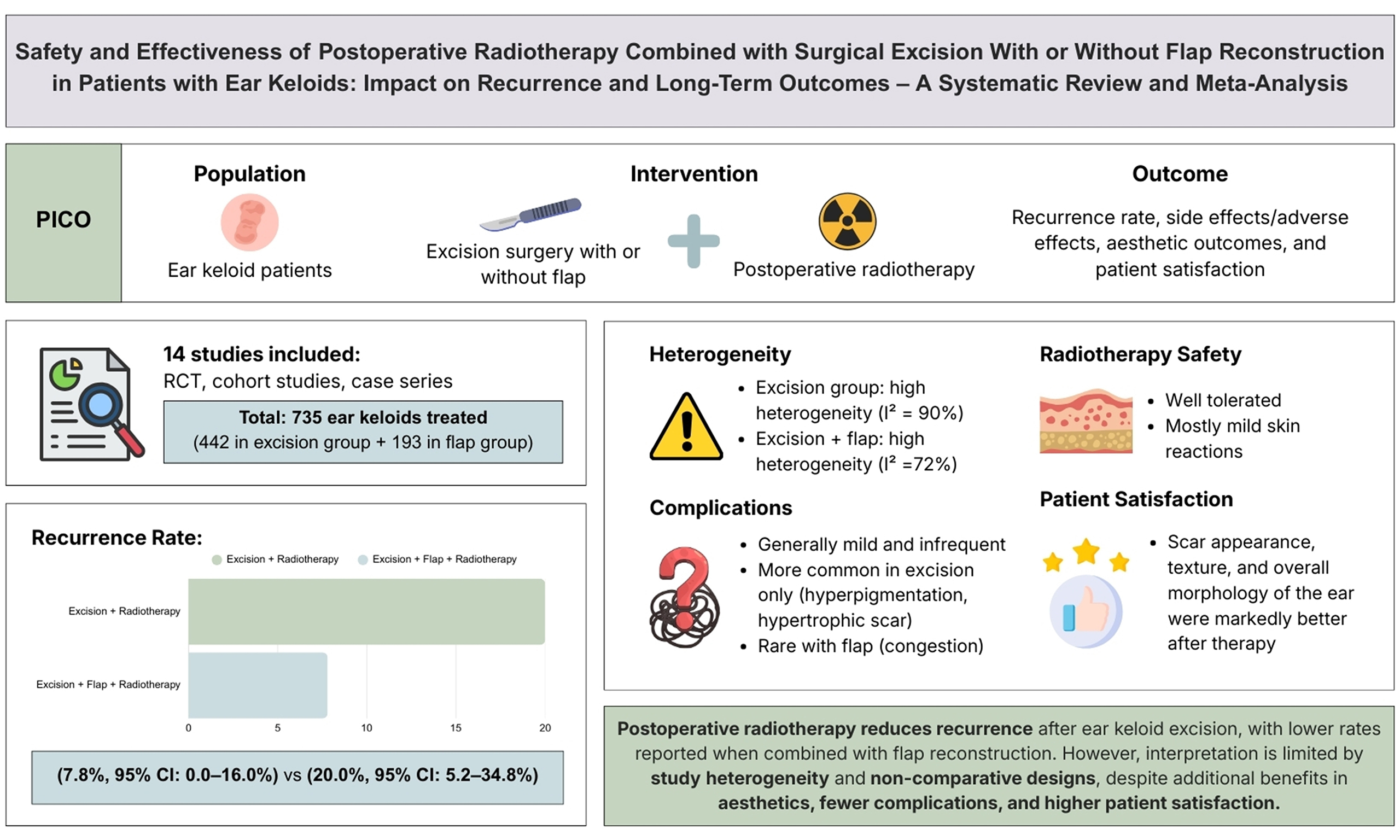 Results: Fourteen studies were included based on the criteria, with 735 treated keloids in total. Pooled recurrence proportions were 7.8% [95% confidence interval (CI): 0.0%-16.0%] in studies reporting excision with flap reconstruction plus postoperative radiotherapy and 20.0% (95%CI: 5.2%-34.8%) in studies reporting excision plus postoperative radiotherapy without flap reconstruction. Reported adverse effects were generally mild, most commonly pigmentary change and hypertrophic scarring; flap-related events were uncommon. However, long-term oncologic risk could not be reliably assessed, as most included studies had limited follow-up and were not designed to detect rare late events. Cosmetic outcomes and patient satisfaction were frequently reported as favorable across the subset of studies that assessed these outcomes.
