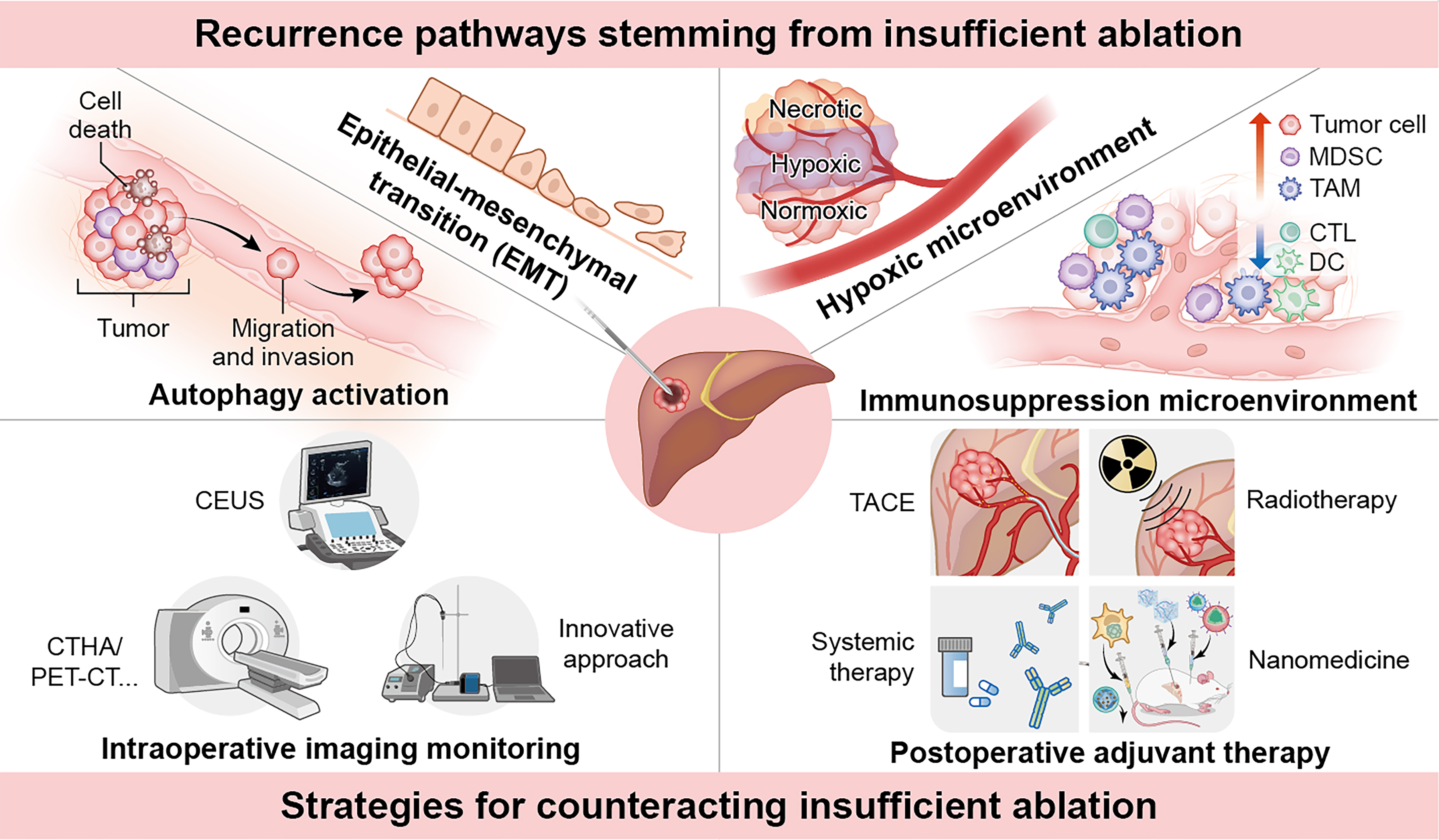 Thermal ablation has become a crucial therapeutic modality for HCC, particularly in patients with impaired liver function or those unsuitable for surgical resection. Despite its minimally invasive nature and relatively high local control rates, postoperative tumor recurrence remains a significant clinical challenge[2,3]. The primary cause of recurrence is insufficient ablation leading to rapid progression of residual tumor cells, driven by key mechanisms such as autophagy activation, EMT, hypoxia-induced signaling, and tumor immune evasion. These biological processes collectively establish a tumor-promoting microenvironment around residual lesions, representing a major barrier to therapeutic efficacy[3,10,33].