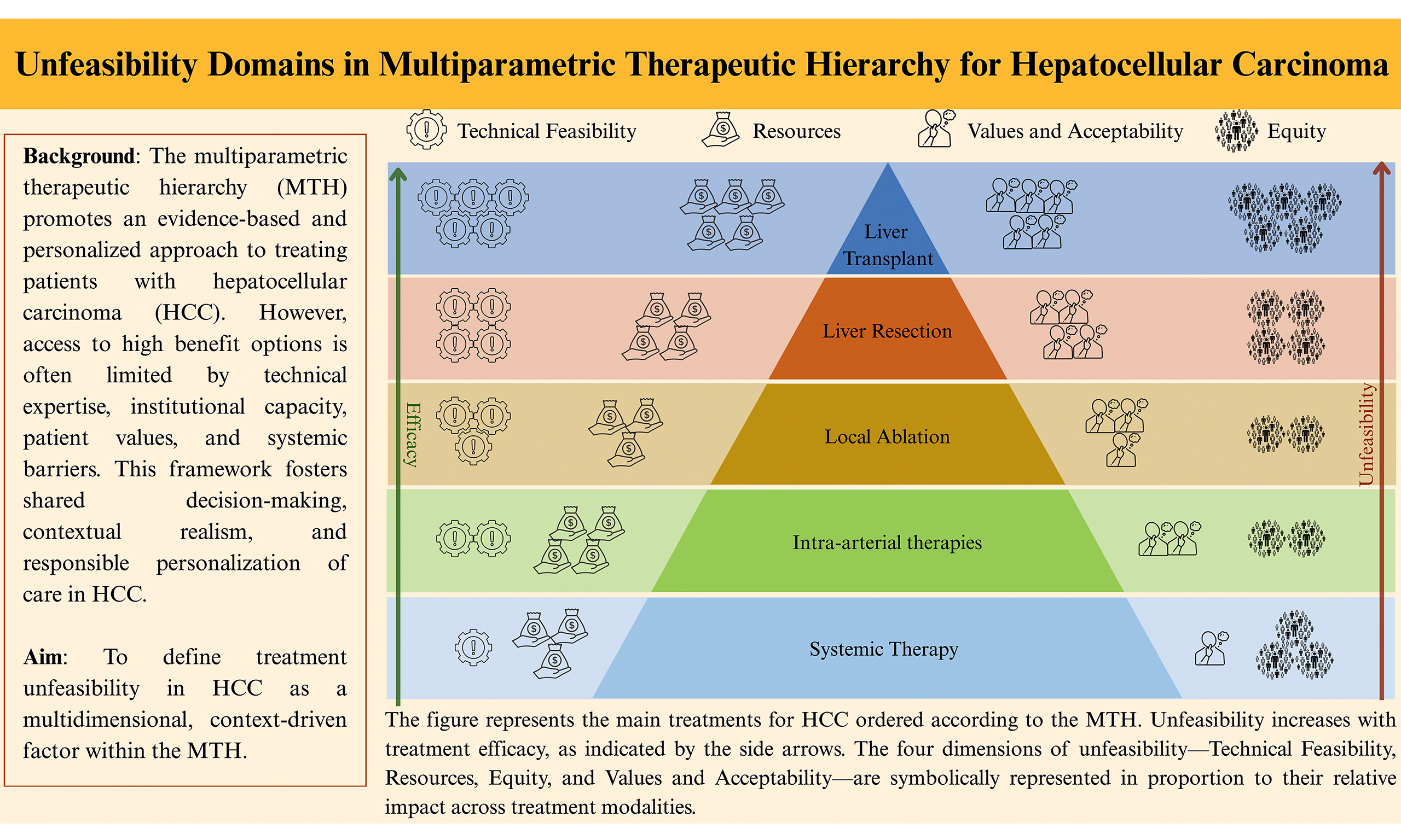 Hepatocellular carcinoma (HCC) is the most prevalent primary liver malignancy and represents a significant global health challenge due to its high incidence, frequent association with underlying liver disease, and persistently elevated mortality rates despite recent therapeutic advances[1]. The therapeutic landscape has become increasingly complex, encompassing curative options such as liver transplantation (LT), liver resection (LR), and local ablation (LA), alongside intra-arterial therapies (IATs), external beam radiation therapy (EBRT), and systemic treatments (STs)[2]. To navigate this complexity, systems such as the Barcelona Clinic Liver Cancer (BCLC) algorithm[3] and, more recently, the Multiparametric Therapeutic Hierarchy (MTH)[4] framework have been developed to support treatment selection based on tumour burden, liver function, and patient general health conditions. One of the main differences between the MTH and the BCLC algorithm is that the BCLC often assumes an idealised context, thereby underestimating real-world barriers that may render a theoretically appropriate treatment unfeasible. This limitation is particularly relevant in clinical scenarios where the certainty of evidence supporting one treatment option over another is low or very low, and where guidelines appropriately offer conditional recommendations or multiple reasonable alternatives rather than a single preferred strategy[5]. Notably, the most recent 2025 update of the BCLC system explicitly acknowledges these limitations by introducing the CUSE framework, Complexity, Uncertainty, Subjectivity, and Emotion, as a conceptual recognition that treatment decision-making in HCC cannot be fully captured by rigid, stage-based algorithms alone[6]. This evolution reflects an increasing awareness that uncertainty is inherent to HCC management and that individual values, contextual factors, and expert judgment inevitably influence clinical decisions. Conversely, among the variables explicitly incorporated into the MTH model is treatment unfeasibility, a concept that this paper seeks to explore and refine. Rather than limiting the notion of unfeasibility to the presence of absolute contraindications, we propose a broader, more granular interpretation that reflects the true complexity of HCC management in clinical practice.