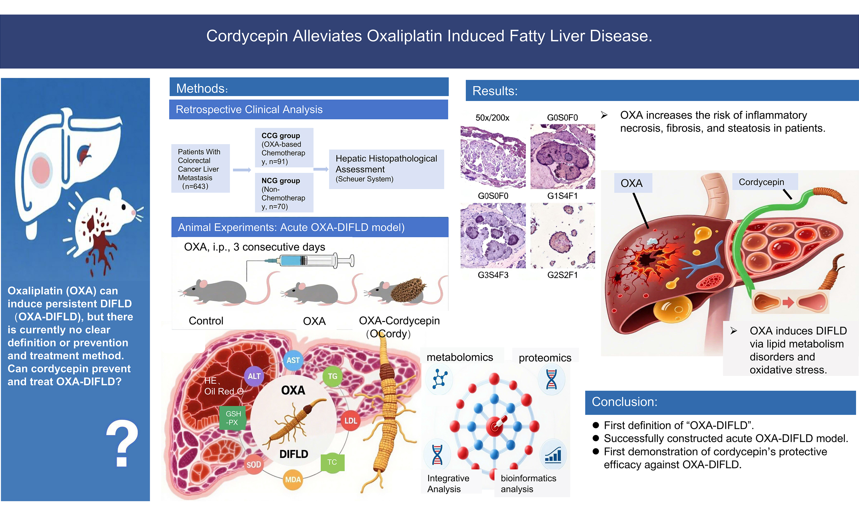Conclusion: This study characterized OXA-induced DIFLD and validated cordycepin’s protective effects via the α-ketoglutarate-arginine/bile acid axis, offering a foundation for treating OXA-induced liver injury.
