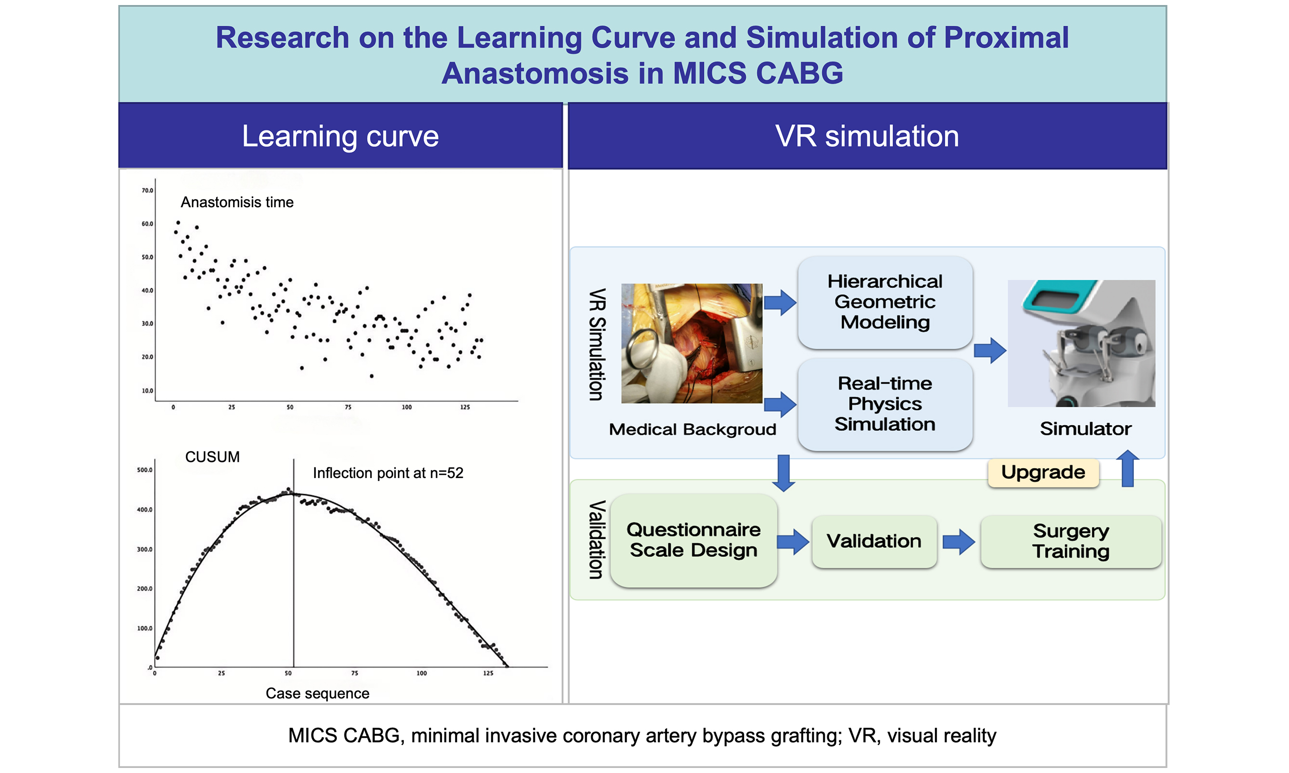 Methods: We analyzed 132 consecutive off-pump MICS CABG procedures with multi-vessel grafting performed by a single surgeon (January 2017-January 2020). Proximal anastomosis time was plotted against case sequence, and the learning curve was quantified using cumulative summation analysis. A VR simulation platform was developed to reproduce key clinical challenges, using hierarchical geometric modeling and real-time physics simulation of tissue-instrument interactions with haptic feedback. Cardiac surgery experts evaluated the VR simulator via a structured questionnaire.