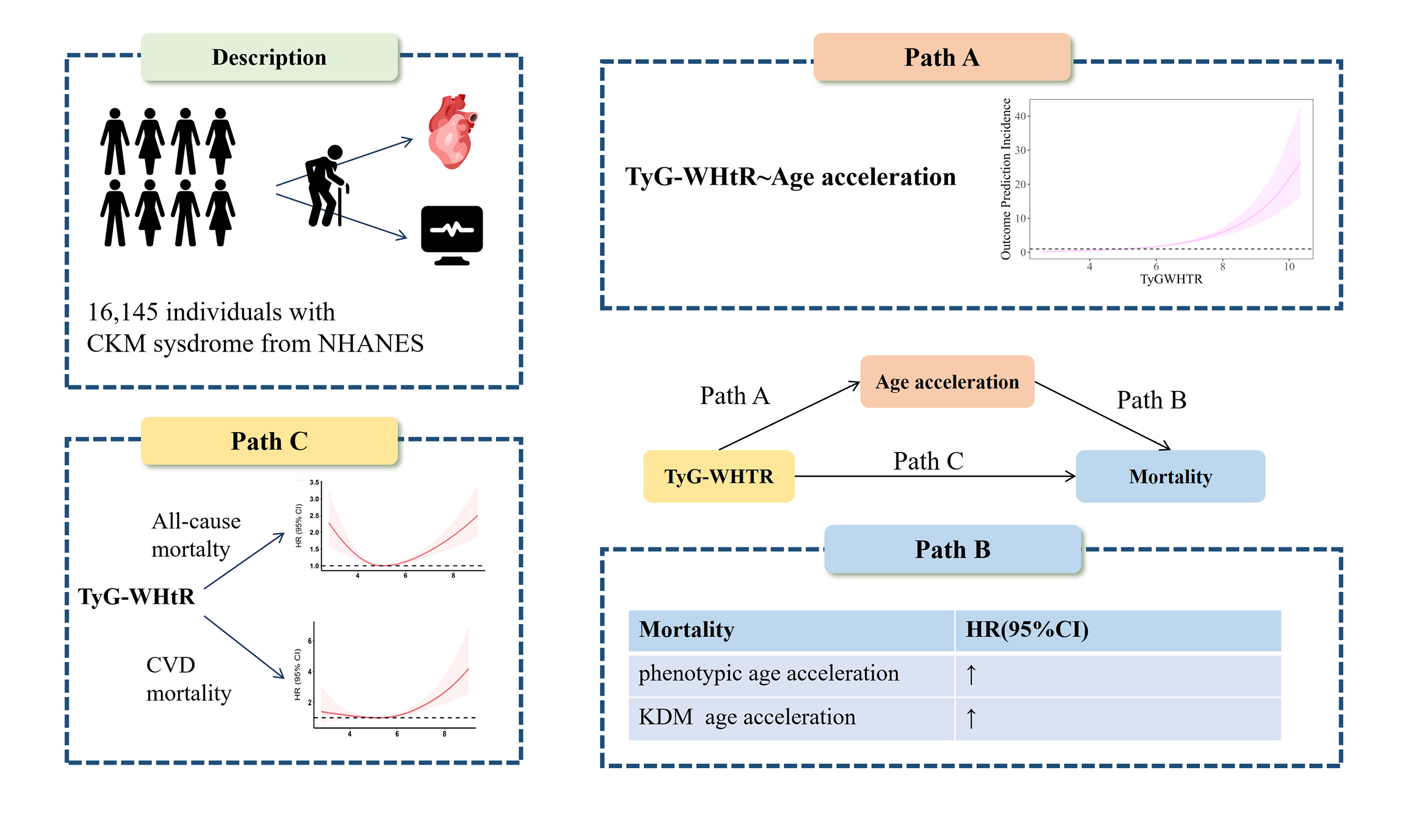 Conclusion: TyG-WHtR is associated with mortality in patients with CKM syndrome, partly through accelerated aging. It is positively associated with age acceleration and exhibits a U-shaped relationship with mortality. Targeting the metabolic-aging crosstalk may help reduce mortality in CKM patients.