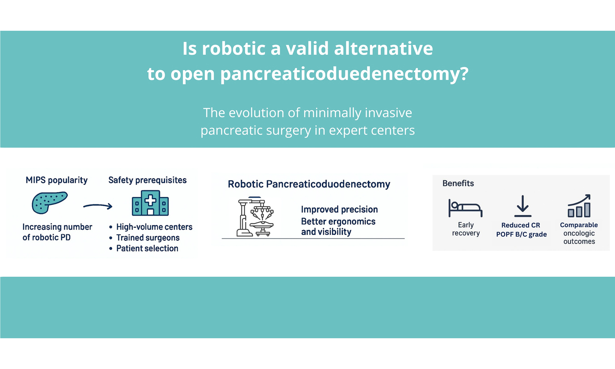 In conclusion, in high-volume centres with experienced and well-trained surgeons, RPD can be considered a viable alternative to OPD, offering reduced intraoperative blood loss, fewer postoperative complications, shorter hospital stays, and a lower incidence of CR-POPF. Nevertheless, robust long-term oncological data are still lacking, and further studies with extended follow-up are required to confirm these results. Emerging evidence also indicates a potential benefit in terms of postoperative quality of life and earlier return to daily activities, although these areas remain under-investigated. Furthermore, the robotic platform may play a significant role in surgical training, offering improved ergonomics, simulation modules, and support for complex reconstructions. Looking forward, the integration of ongoing RCTs, international registries, and new technologies, including next-generation robotic systems and artificial intelligence-based intraoperative support, will be crucial to fully establish the role of RPD in standard surgical practice.