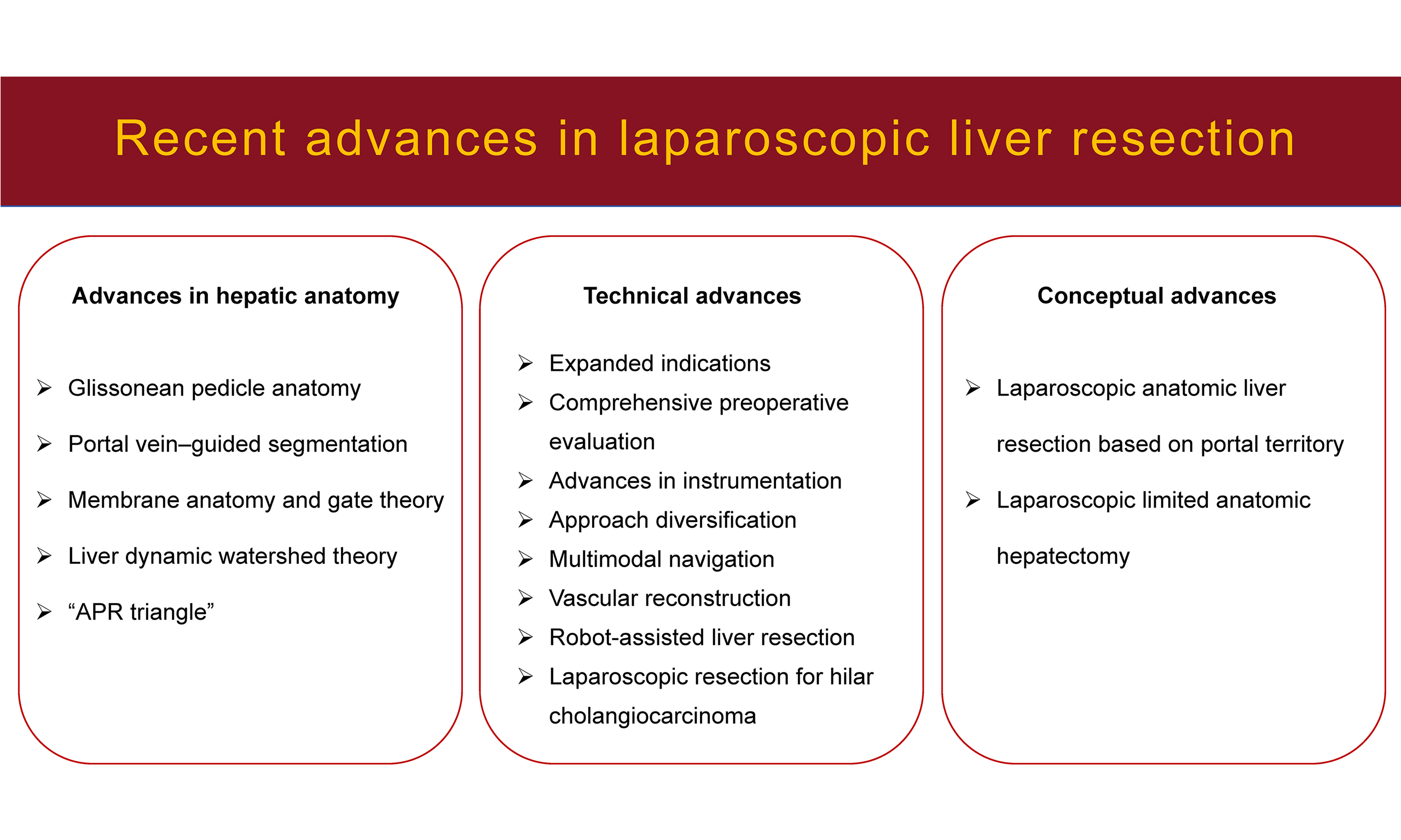 Since the first laparoscopic liver resection (LLR) was reported in 1991, both surgical techniques and conceptual frameworks have developed rapidly worldwide. Progress in hepatic anatomy - from the classical Couinaud segmentation to refined subsegmental and dynamic portal territory systems - has provided a stronger foundation for precision liver surgery. The “gate theory” and its application in LLR have further enhanced the safety and reproducibility of anatomic dissections. Technically, indications for LLR continue to expand, preoperative evaluation has become more precise, and there has been rapid development in multimodal intraoperative navigation, vascular reconstruction techniques, and robot-assisted surgery. Conceptually, emerging strategies such as anatomic resection based on portal territory and limited anatomic resection are becoming key directions for precision liver surgery. Overall, LLR is advancing toward standardization, precision, and individualization, and is increasingly recognized as a mainstream approach for hepatic resection.