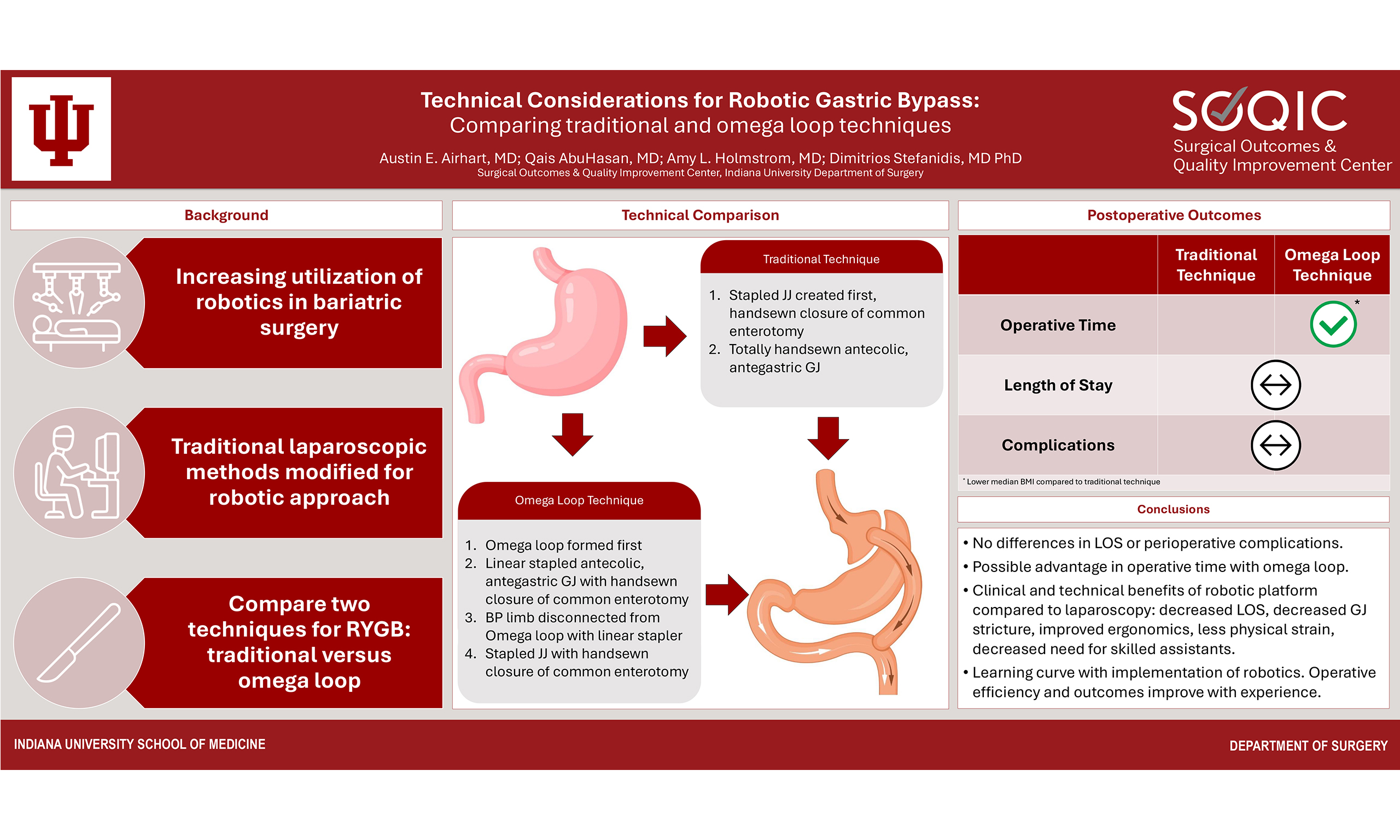 In review of our own institutional data from 2024, primary RYGB procedures were identified and categorized according to operative technique (traditional vs. omega loop). Revisional cases were excluded from analysis along with cases in which a concomitant procedure was performed (e.g., hiatal hernia repair, ventral hernia repair, etc.). There were no significant differences in rate of postoperative complications between the two operative techniques. The majority of patients in both groups were discharged on postoperative day 1 or 2, and there were no differences in hospital length of stay between groups. Cases performed with the omega loop technique had a significantly shorter operative duration when compared to the traditional RYGB technique {Omega loop median = 129 m [interquartile range (IQR) = 100, 158] vs. traditional median = 161 m (IQR = 130, 192); P < 0.001}. However, the median BMI of patients who underwent omega loop technique was slightly lower [43 (IQR = 37, 49) vs. 50 (IQR = 37, 63); P = 0.006], which may account for the difference in operative duration. Differences in median BMI between patients undergoing each operative technique are attributed to differing referral patterns and number of years in practice between two surgeons. Additional research comparing postoperative outcomes between these two operative techniques is ongoing.