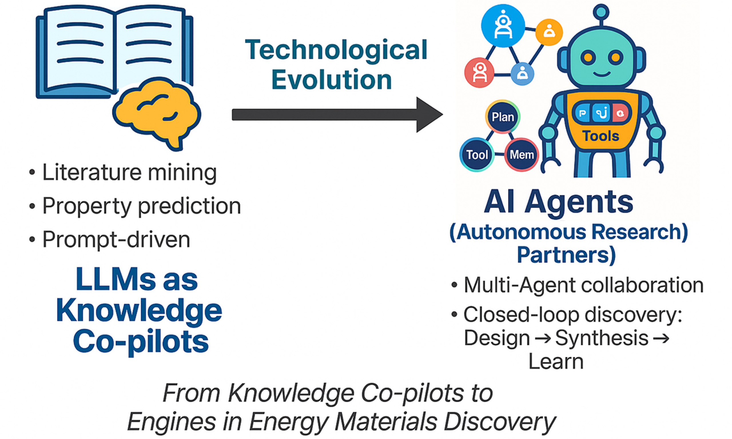 Figure 1. Evolution from LLMs to AI Agents in Energy Materials Research. Phase 1 depicts large language models (LLMs) acting as knowledge-augmentation tools, where human researchers employ prompt-based interaction for data extraction, literature mining, and property prediction, functioning as a “Knowledge Co-pilot”. Phase 2 illustrates an AI-driven human-robot collaboration, in which an AI Agent with an LLM-driven core autonomously plans, executes, and analyzes experiments. Robotic systems carry out experimental tasks under human supervision, closing the loop from hypothesis generation to data validation. AI: Artificial intelligence.