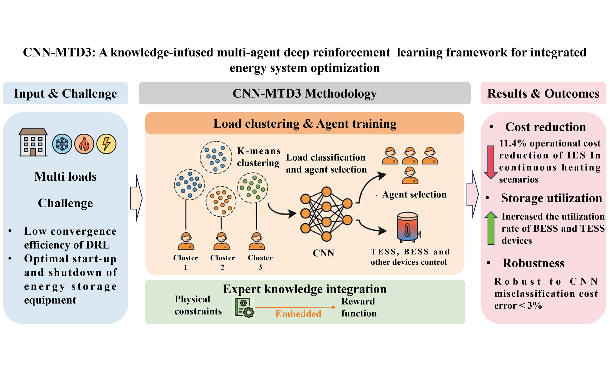 In response to the defects mentioned above, this study proposes a DRL framework called CNN-MTD3, which aims to optimize the scheduling of IES throughout the year. The CNN-MTD3 framework involves training multiple TD3 agents to handle various loads and employing a convolutional neural network (CNN) for agent recognition and control. Expert knowledge is incorporated into the agents to enhance the model’s accuracy and adaptability, thereby mitigating the error issues inherent to the DRL algorithm.