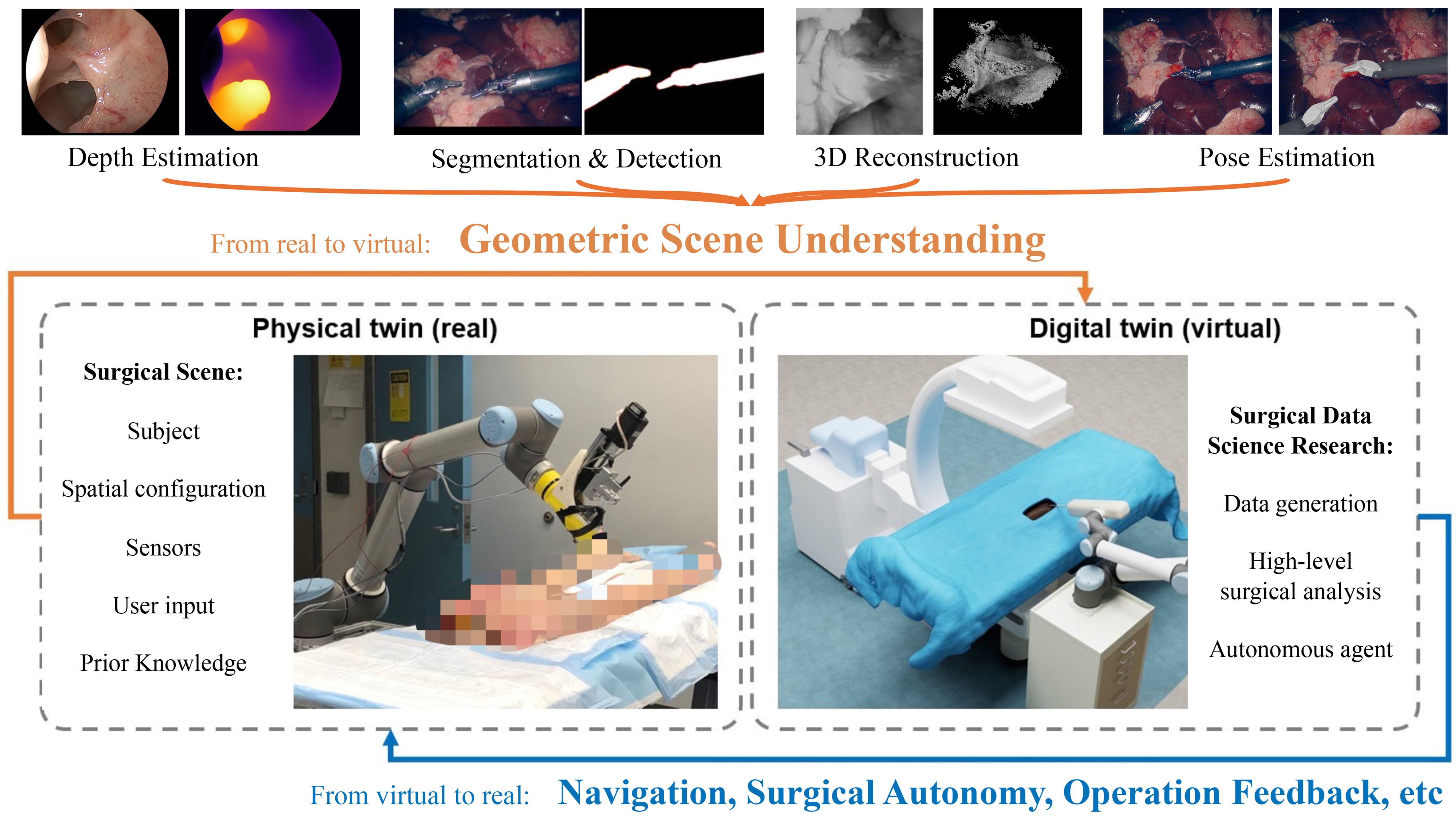 Figure 1. The enabling role of geometric scene understanding for digital twin. All figures in the article are generated solely from the authors’ own resources, without any external references.