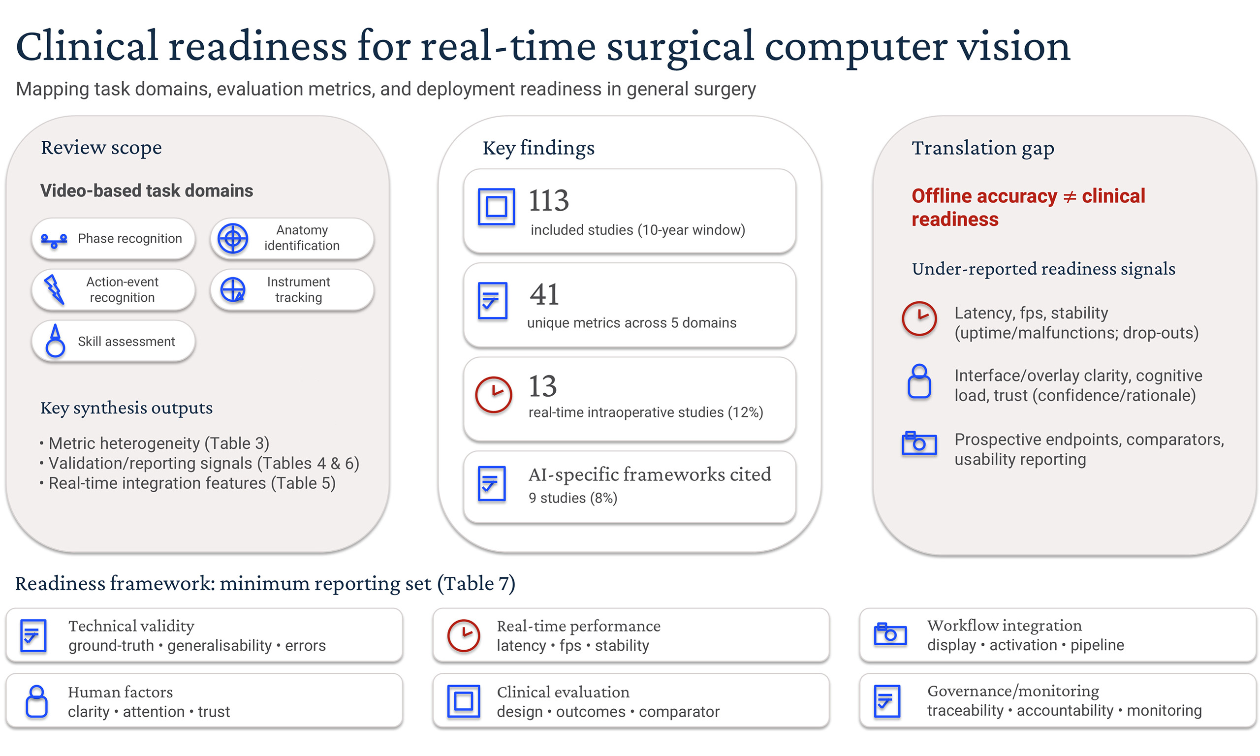 Surgical CV-AI is advancing technically but remains predominantly feasibility-stage, with most models confined to retrospective analyses rather than real-time use. Only 12% of studies evaluated real-time integration, comprising small, single-centre series with feasibility-oriented endpoints, variable blinding, and limited comparators; highlighting a major translational gap between offline validation and clinical deployment. This review confirmed substantial heterogeneity in metric selection and clinical integration of CV-AI. Across five principal task domains over 40 unique performance metrics were identified, though were variably applied, consistent with two recent reviews evaluating anatomical segmentation CV-AI in laparoscopic procedures, including those outside general surgery[9,14]. Surgeon feedback was collected post-hoc after model development and validation, suggesting that end-user engagement typically follows, rather than precedes, system readiness. Additionally, agreement between expert annotators within studies was uneven, with adherence to recognised frameworks seldom reported. While anatomical delineation and phase recognition signal areas of emerging promise, studies remain yet to determine whether CV-AI meaningfully improves surgeon performance, intraoperative judgement, or operative outcomes. The study findings are synthesised into a concise evaluation framework in Table 7, highlighting the concentration of current evidence around retrospective feasibility, and relative scarcity of reporting on real-time system performance (i.e., latency, usability, and prospective outcomes). This framework especially underscores that CV-AI translation hinges on workflow integration and human factors alongside conventional discrimination metrics.