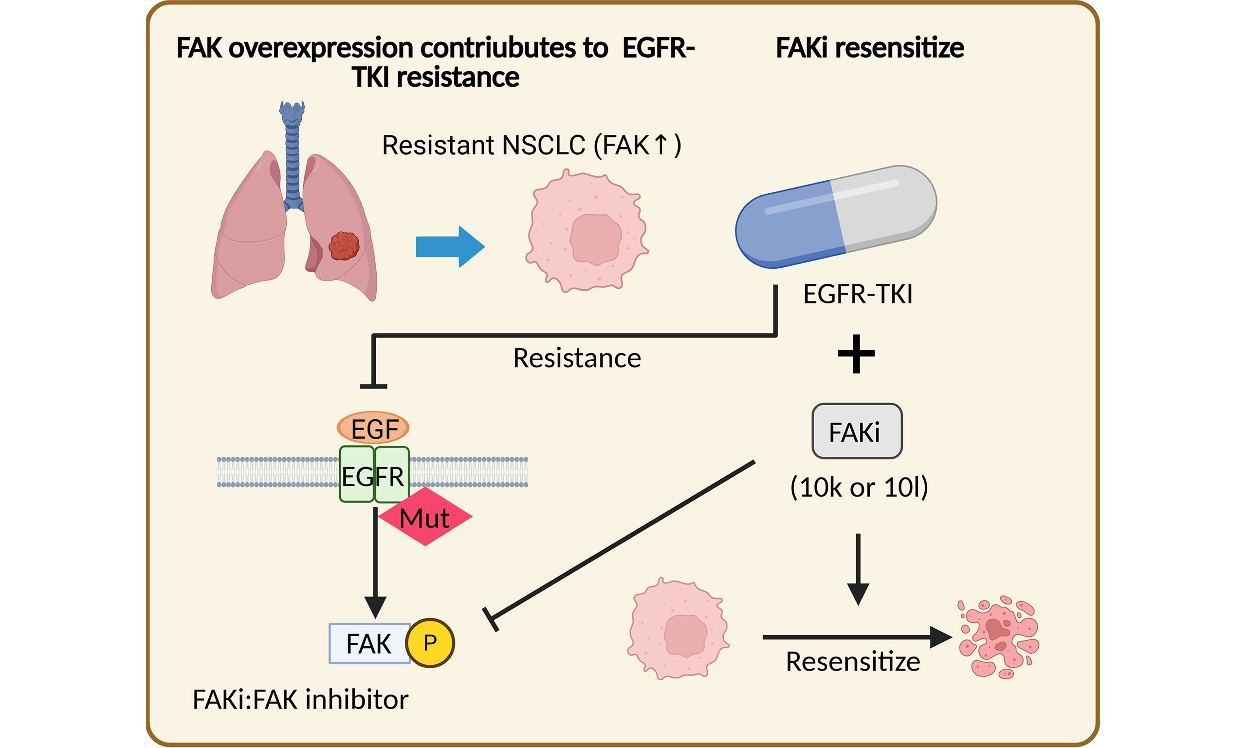This study integrated data from patients treated with EGFR-TKI and kinase/polymerase chain reaction (PCR) arrays of two drug-resistant cell lines [PC9 Afatinib resistant (PC9AR), H1975 Osimertinib resistant (H1975OR)]. The results showed that in The Cancer Genome Atlas (TCGA)-NSCLC database, FAK was not related to OS, but in our NSCLC patients receiving EGFR-TKI cohort, high FAK expression indicated poor prognosis; resistant cells likewise showed FAK upregulation, and FAK was identified as a resistance “hub” gene. Our newly synthesized FAK inhibitors 10k/10l [10k: 3-(6-Furan-2-yl-imidazo[2,1-b][1, 3, 4]thiadiazol-2-yl)-1H-indole; 10l: 3-(6-Furan-2-yl-imidazo[2,1-b][1, 3, 4]thiadiazol-2-yl)-1-methyl-1H-indole] significantly inhibited proliferation across multiple models[24], showed synergy with EGFR-TKI in resistant cells, and 10k suppressed tumors and restored sensitivity to Osimertinib in a drug-resistant xenograft model.