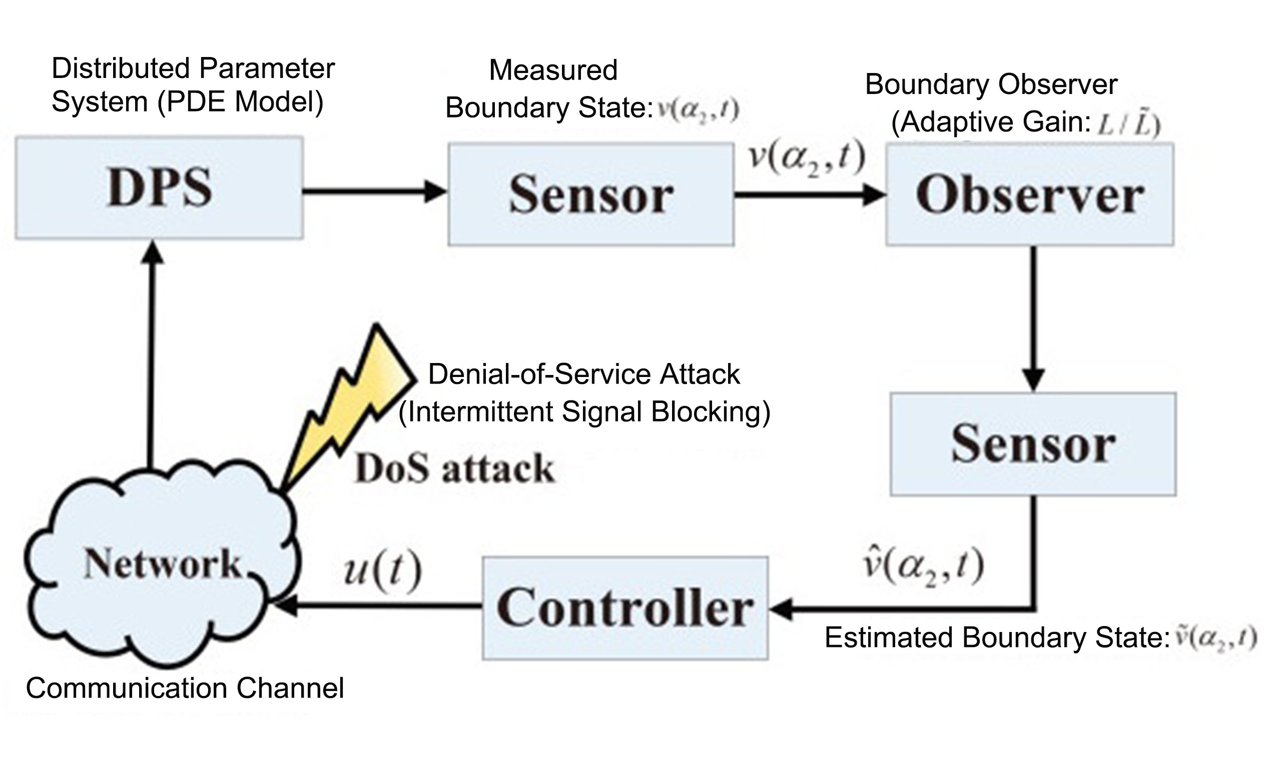 Figure 2. Observer-based boundary control scheme for DPS under DoS attacks.