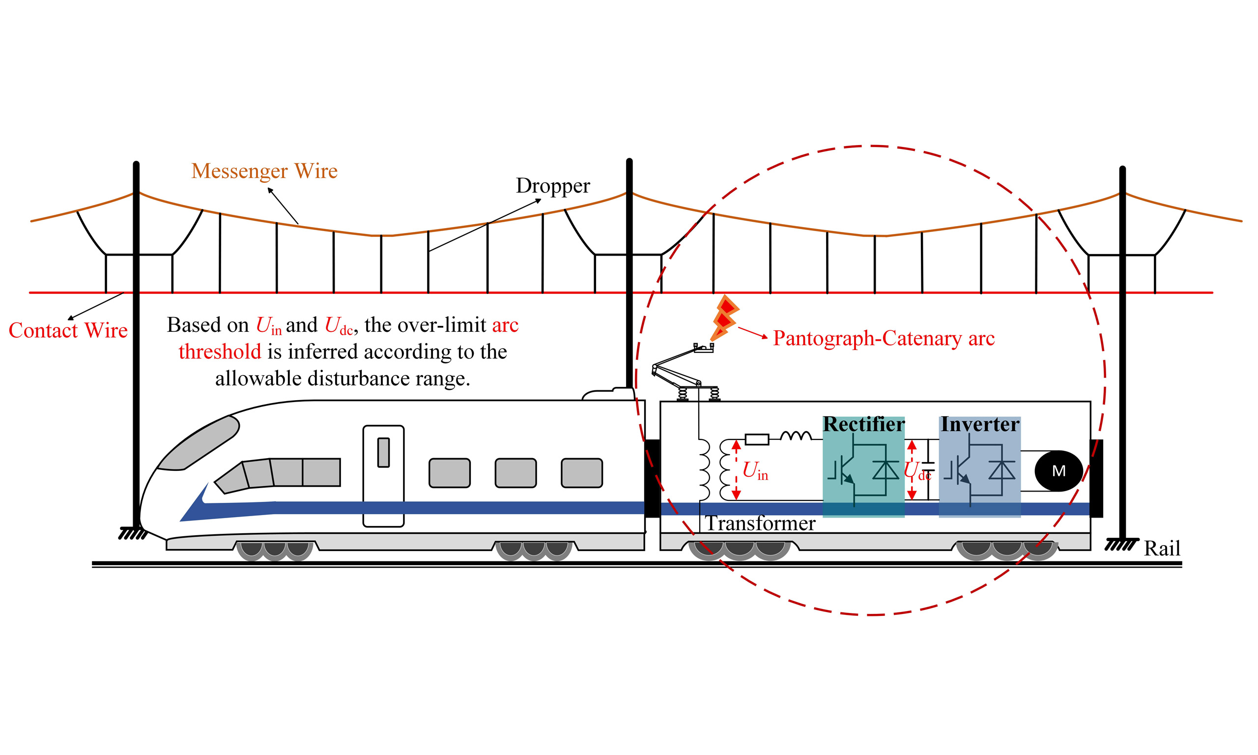 The electrified railway catenary is a suspended system installed along the railway, which supplies electrical energy to trains through sliding contact with the pantograph, serving as the sole source of continuous power for electric locomotives. However, current collection issues remain a major constraint on the stable operation of electrified railways, with pantograph-catenary detachment identified as a critical factor affecting current collection stability. During high-speed train operation, the contact between the pantograph and the catenary is often disturbed by vehicle vibrations, track irregularities[1], and structural hard points[2], resulting in transient separations and electrical arcing[3-5] [Figure 1]. Stability of current collection remains one of the major constraints on the maximum operating speed and reliability of electrified railways, with pantograph-catenary (PC) off-line events recognized as a dominant source of power instability[6,7]. Arcing during these events causes voltage drops at the rectifier side of the traction converter, leading to torque fluctuations in the traction motor[8]. In addition, the resulting arcs accelerate wear of the collector strip[9] and generate harmonic and electromagnetic interference that disrupts traction communication systems[10-12]. Understanding and mitigating PC arcing is therefore essential for improving current collection performance and ensuring the safe, stable operation of high-speed trains.