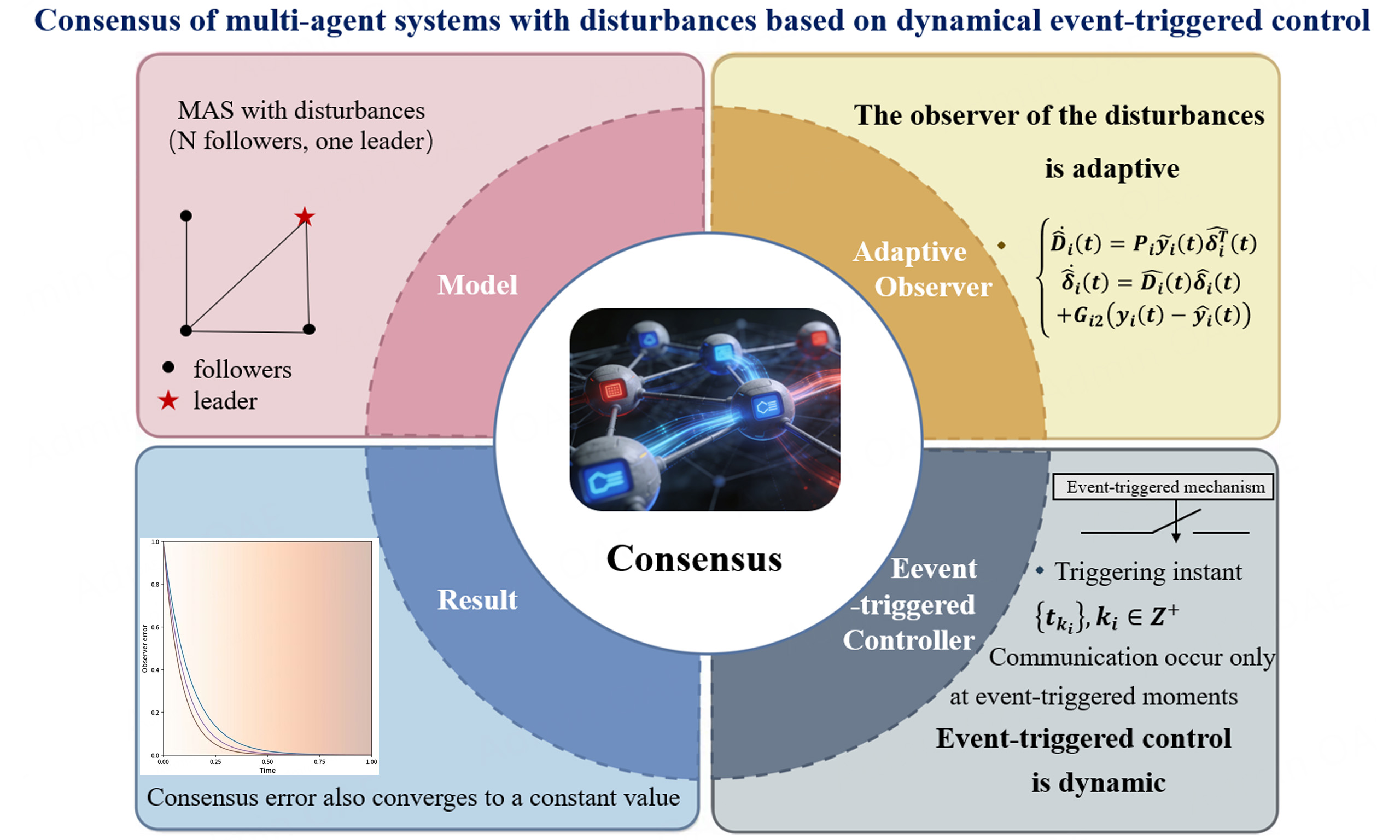 In addition to the above control methods, there is another type of controller, namely event-triggered control, which has received significant attention in recent years. Such a controller determines the triggering instants based on predefined event conditions and can achieve consensus while reducing resource consumption and cost by effectively decreasing the number of sampling instances. For example, Yang et al.[23] adopted event-triggered control in their research on nonlinear MASs under limited communication resources. Li et al.[24] also presented an event-triggered control strategy for time-varying MASs to address parameter uncertainties within a given finite horizon and deception attacks. More recently, to better reflect practical scenarios, dynamic event-triggered control strategies have been proposed [25,26]. Furthermore, studies [22] and [27] have combined pinning control and sampling control with event-triggered control to reach consensus in MASs. In [22], the authors mainly focus on cluster consensus in the presence of acyclic denial-of-service (DoS) attacks, actuator failures, and integral quadratic constraints. In [27], the synchronization problem of first-order MASs with time-varying control gains is investigated under a synchronous periodic sampling framework. However, it does not consider factors such as network attacks or actuator faults; instead, it mainly addresses the synchronization control of nonlinear agents based on sampled data in directed topologies. In addition, in [28], the authors propose both an observer-based event-triggered controller and an observer-based full asynchronous event-triggered controller to study the bipartite consensus problem of MASs under unknown false data injection attack. Event-triggered control has been widely applied in the field of control systems. It can be used not only in consensus studies of MASs but also in investigating annular finite-time