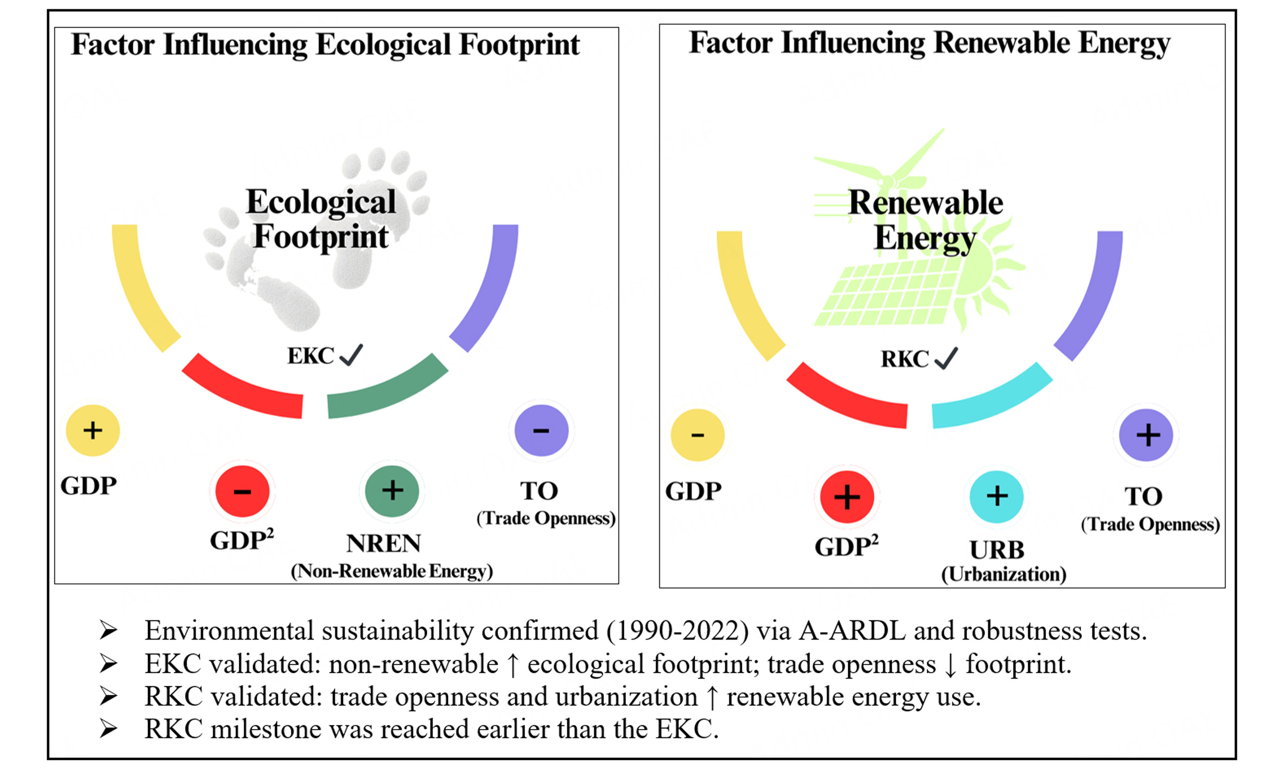 More recently, the theoretical landscape has been enriched by the introduction of the Renewable Energy Kuznets Curve (RKC) hypothesis, proposed by Yao et al.[10] as a complementary perspective. The RKC describes a U-shaped relationship between per capita income and renewable energy consumption (REN). According to this hypothesis, REN initially decreases as developing economies prioritize inexpensive fossil fuels to power their growth. However, after reaching a certain income threshold - supported by strong financing infrastructure and welfare gains[3,11] - rising environmental awareness and technological progress lead to an increase in renewable energy adoption. A critical theoretical proposition is that the income level corresponding to the RKC's turning point should be lower than that of the EKC's peak. This suggests that a successful transition toward renewable energy is a prerequisite for achieving long-term environmental improvement, causing the RKC to "turn" before the EKC[10].
