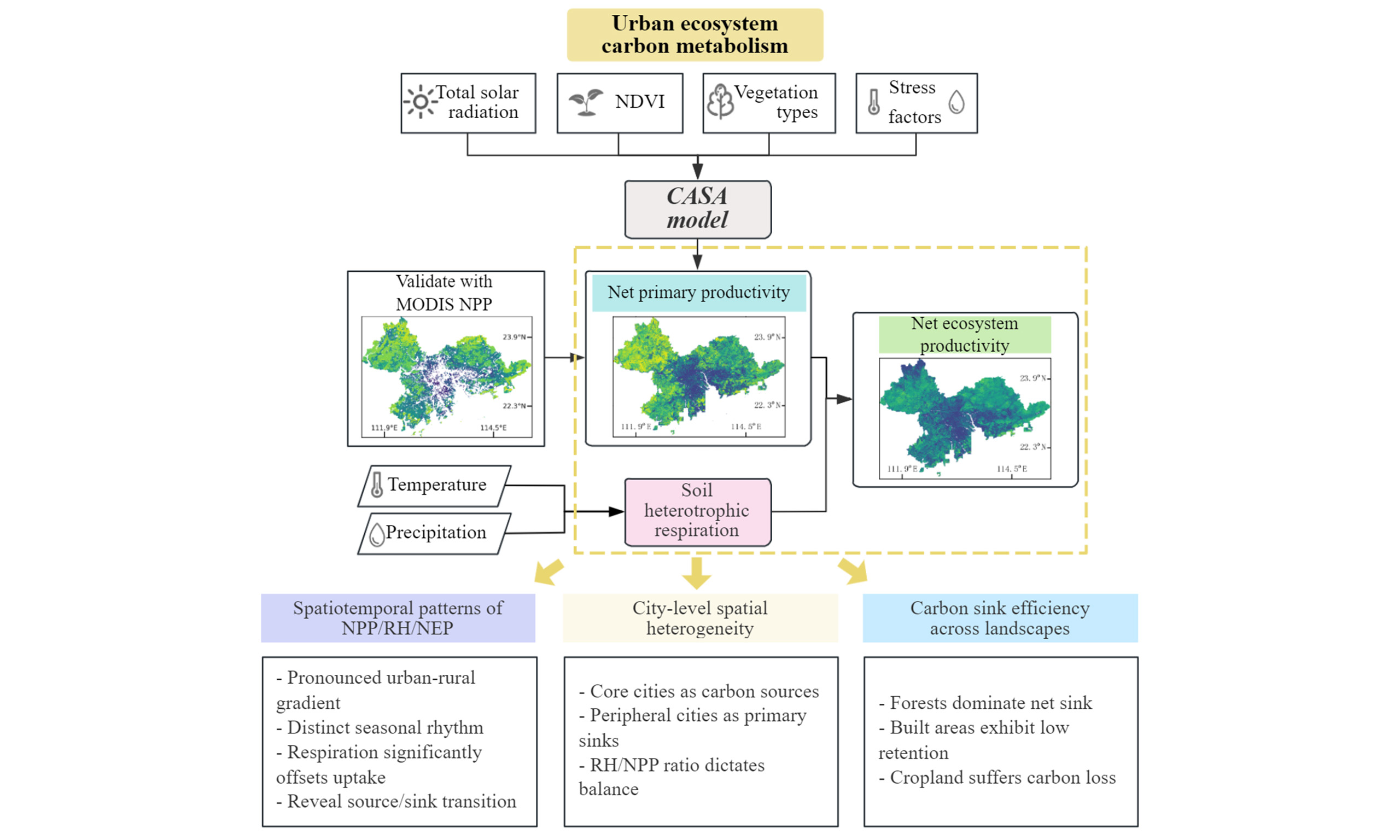 Here, we developed a 250 m-resolution modeling framework that combines the CASA model with a RH accounting model driven by temperature and precipitation to derive accurate monthly NEP for the urban area. Taking the Pearl River Delta region of China as an example, we systematically analyzed urban carbon metabolism characteristics at the city level and across different land cover types. Our high-resolution method can identify small-scale carbon sink patterns that were previously overlooked in coarse-grained urban area assessments, providing valuable insights for understanding the carbon cycle mechanisms in rapidly developing megacity regions.