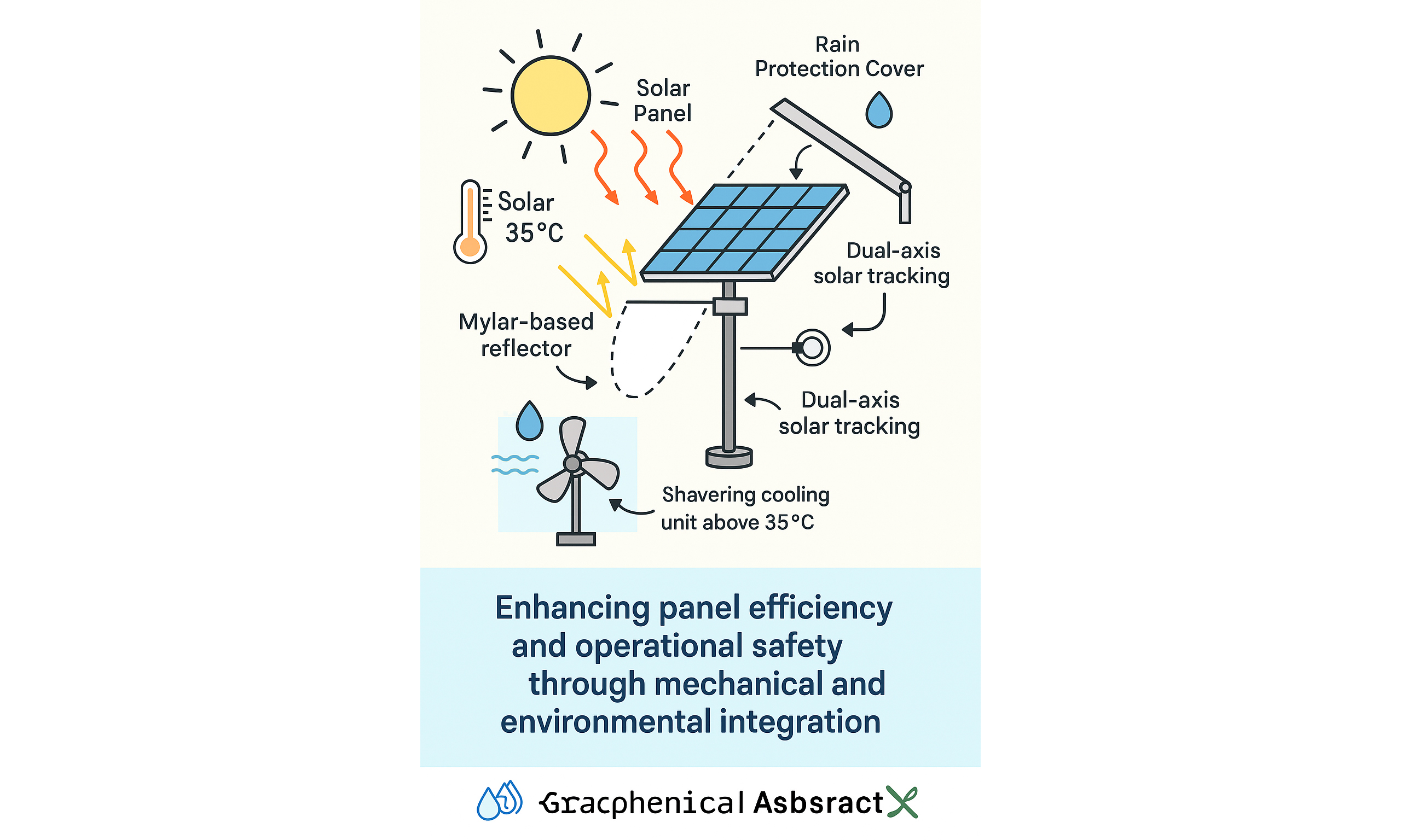 Solar photovoltaic (PV) systems face significant challenges, including low energy conversion efficiency, performance degradation due to overheating, and operational risks from environmental factors such as rainfall and dust. To address these issues, this study presents an innovative solar energy solution aimed at enhancing panel efficiency and operational reliability through mechanical and environmental integration. The system incorporates a Mylar-based reflector to boost solar irradiance, an automated rain protection cover activated by sensors, a dual-axis solar tracking system for continuous sun alignment, and a temperature-controlled cooling system that activates above 35 °C. Implemented on a 20W Mono PERC (Passivated Emitter Rear Cell) panel, the system was tested under real-world conditions. Results showed a cumulative efficiency improvement compared to a conventional fixed panel. The reflector and tracking system contributed most to output gains, while the rain cover and cooling system improved durability and thermal performance. Overall, the integrated system achieved 50%-55% higher energy production than the conventional fixed panel. These findings highlight a cost-effective approach to advance low-carbon energy transitions and promote renewable adoption in semi-arid urban areas.