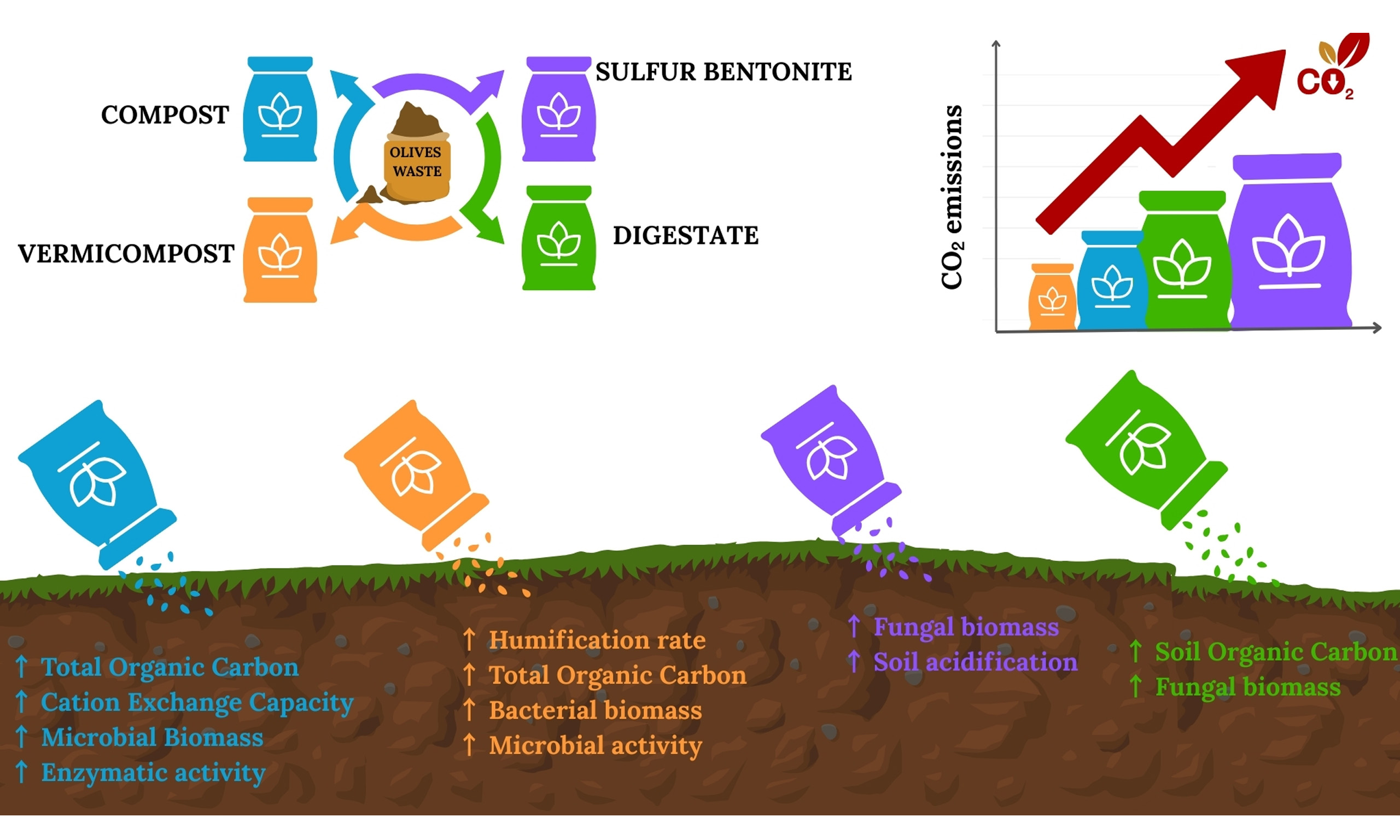 Integrating CFP assessment with a mechanistic understanding of soil carbon stabilization, this study evaluates the dual contribution of these regionally relevant amendments to climate mitigation and soil health. Specifically, we investigate how compost, vermicompost, digestate, and sulfur bentonite with olive pomace (SBO) influence soil carbon accumulation, microbial activity, and the balance between fungal- and bacterial-mediated pathways of organic matter transformation.