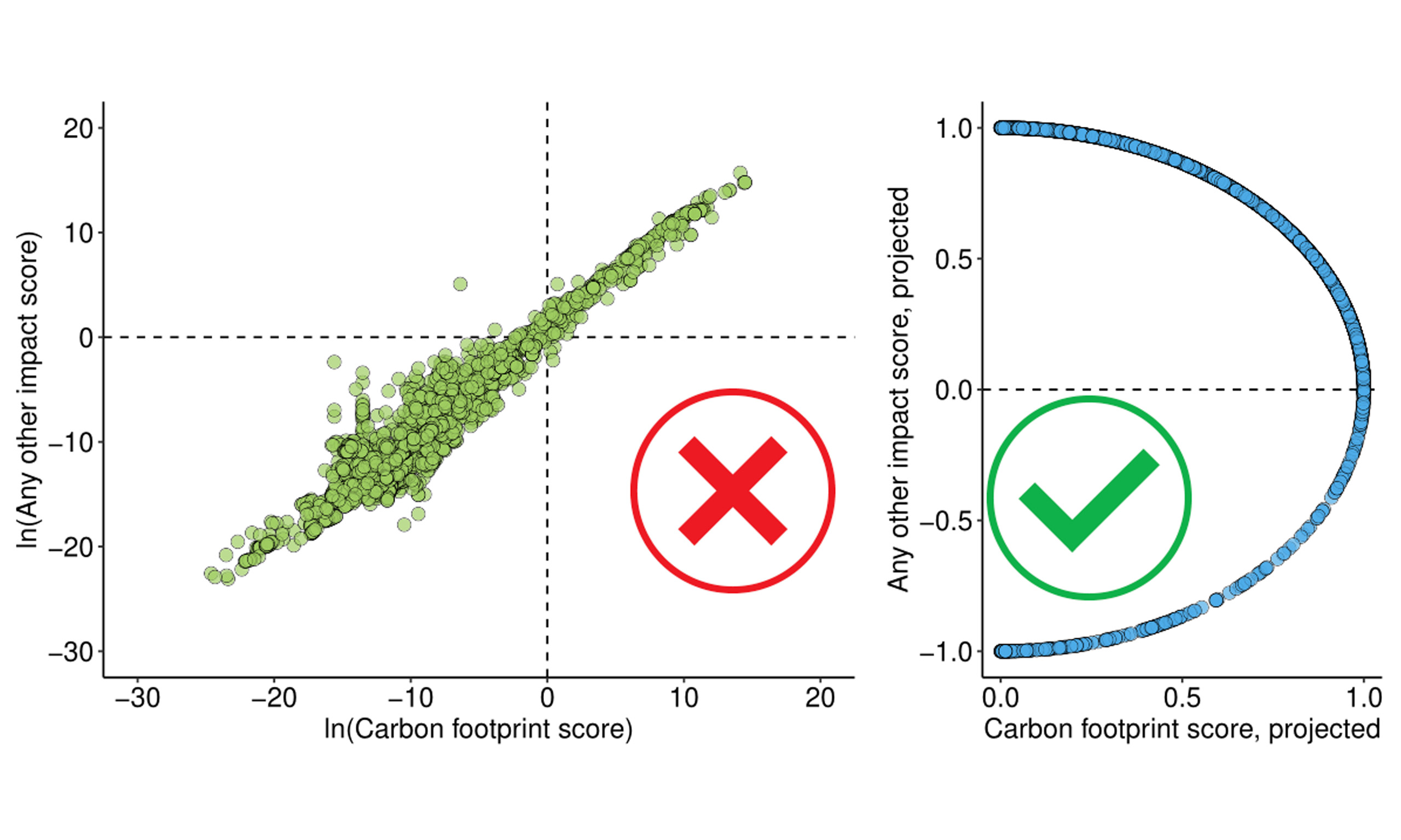 [6] analyzed the suitability of using CF as a proxy for multiple impact categories based on a sample of 3,953 products. Their analysis relied on correlation measures, which [15] have shown to be vulnerable to methodological limitations. The primary issue is that each data point (xi,yi) has an essentially arbitrary scale: it could be rescaled to (cxi,cyi) for any c $$ \in \mathbb{R}^{+} $$. For example, one data point may represent 1 kg of concrete, but it could equally represent 1,000 kg, 1 m3, or 1 ounce. Because all impact indicators, including CF, scale proportionally with the quantity of product, rescaling alters the data point’s location and, consequently, the value of the correlation coefficient. Thus, the correlation reported in[6] depends on 3,953 largely arbitrary choices.