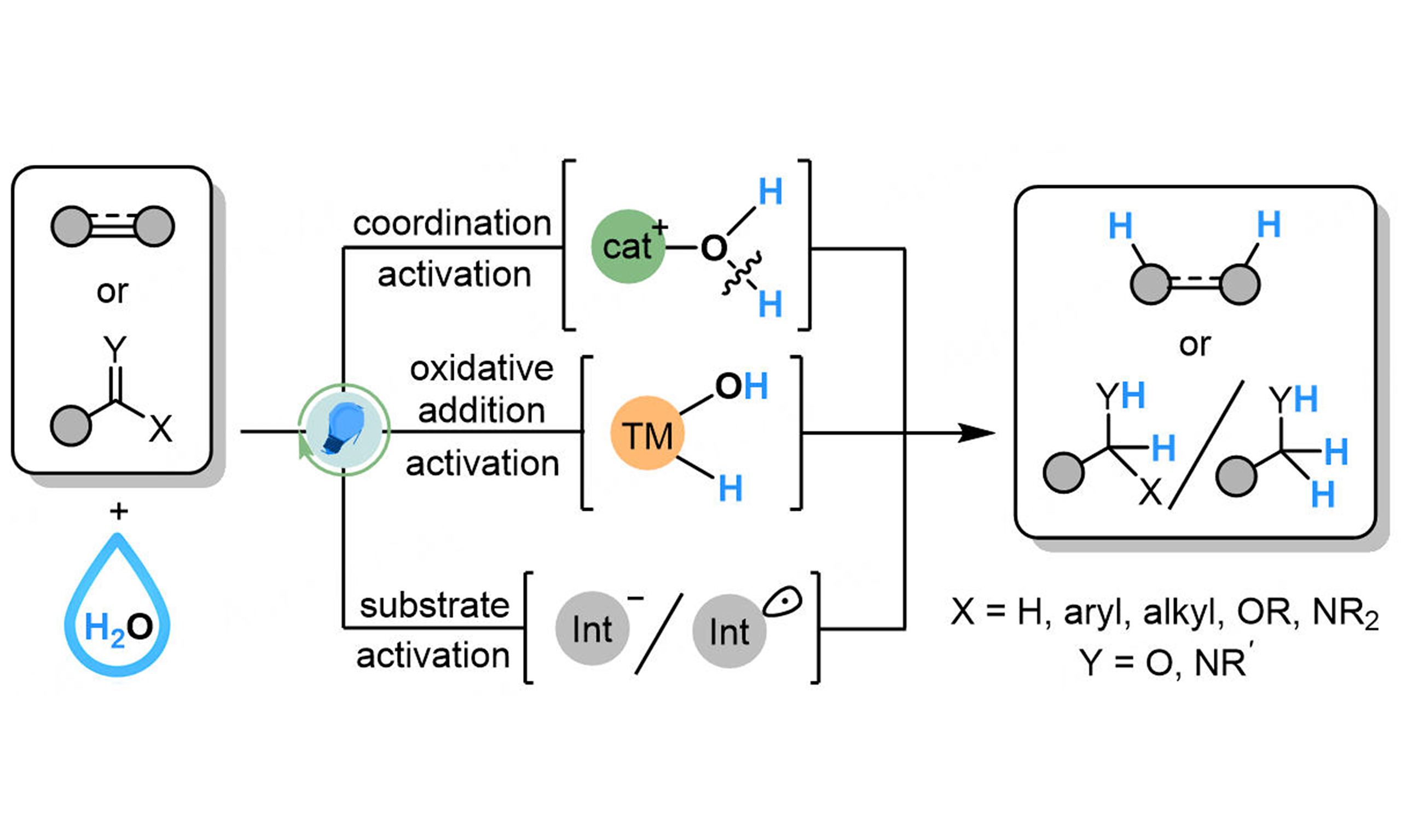This review focuses on the advances in photocatalyzed H2O-incorporated reduction of unsaturated compounds, where H2O acts as a hydrogen source under mild conditions; the following discussions would base on the three models in Scheme 2 including: (1) Photocatalyzed hydrogenation of unsaturated compounds by coordination activation of H2O; (2) Photocatalyzed hydrogenation of unsaturated bonds by activation of H2O through oxidative addition; (3) Photocatalyzed hydrogenation of unsaturated bonds with H2O through substrate activation.