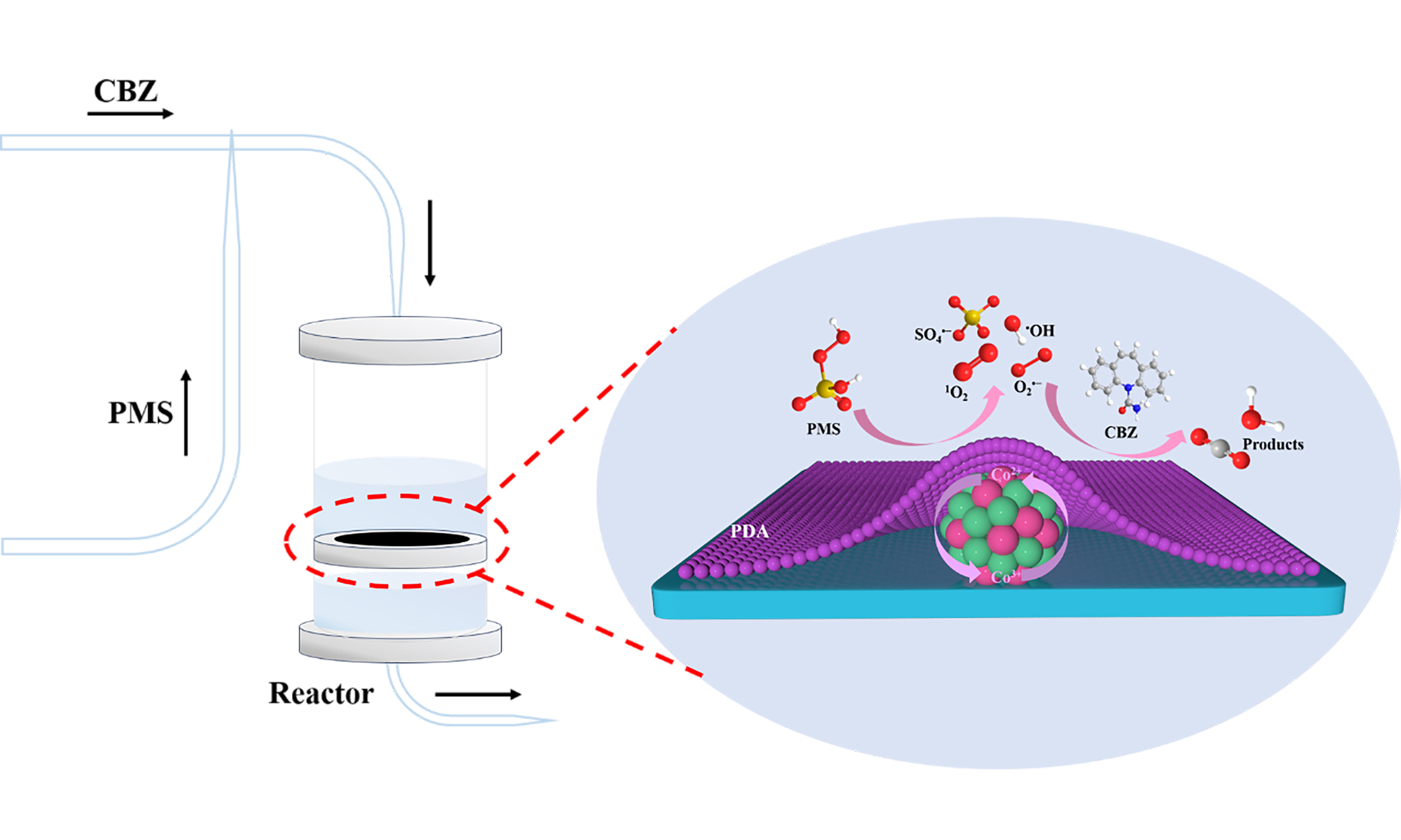 In summary, a highly efficient and stable Co/N@ZS-PDA catalyst was synthesized via a PDA film decoration strategy, affording a degradation rate of over 90% for CBZ within 20 min. The long-term dynamic experiment over the Co/N@ZS-PDA membrane can be operated continuously for more than 160 h, while maintaining a CBZ removal efficiency of over 90%. The PDA decoration Co/N@ZS catalyst facilitates a strong interaction between Co species and the support by employing an electronic transfer mechanism from Co0 sites to CoOx species, endowing remarkable stability and good activity for CBZ degradation. By combining controlled experiments and in-depth characterization, the degradation of CBZ in the Co/N@ZS-PDA/PMS system involves both radical and non-radical pathways, with the non-radical pathways primarily driven by 1O2 playing a predominant role. This work provides a new strategy for addressing the Co leaching and elucidates the reaction mechanism, thereby paving the avenue for potential practical applications in pollution degradation toward AOPs.
