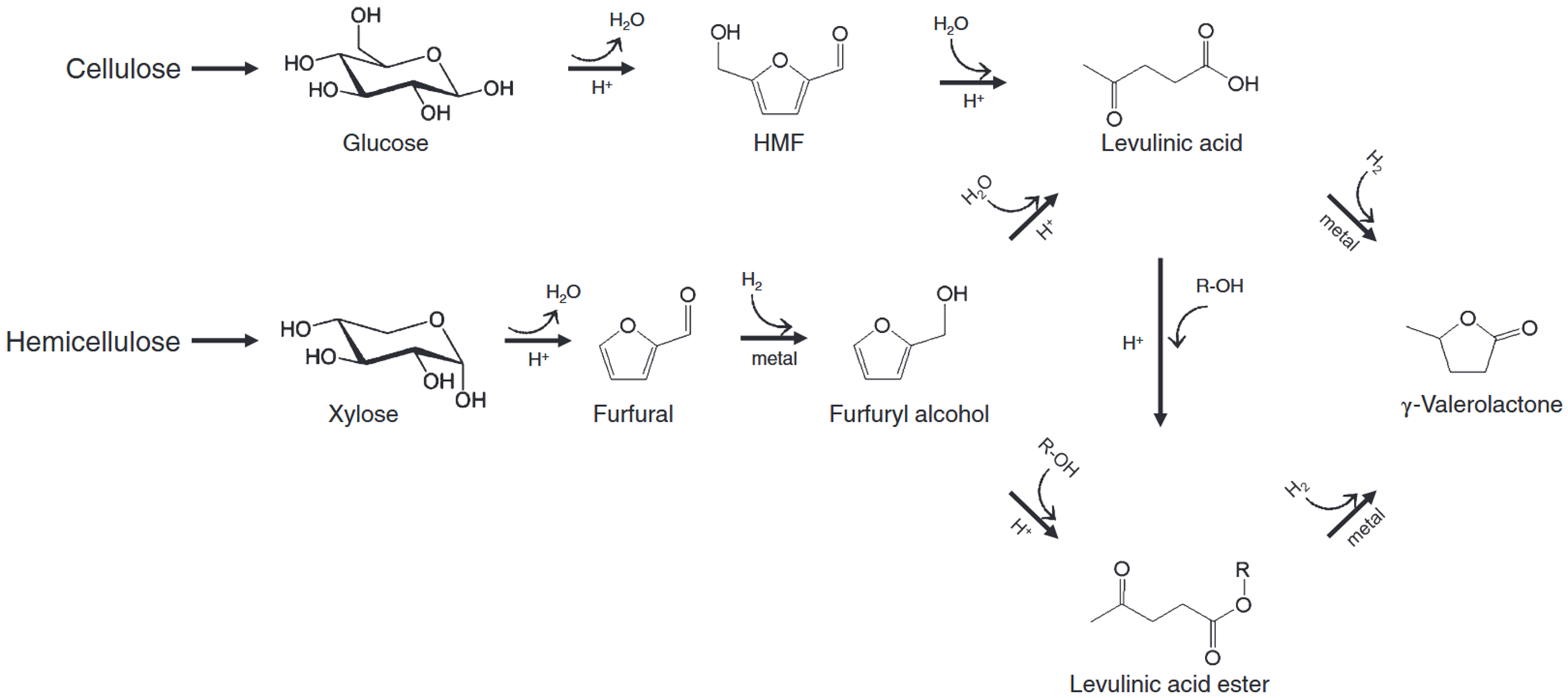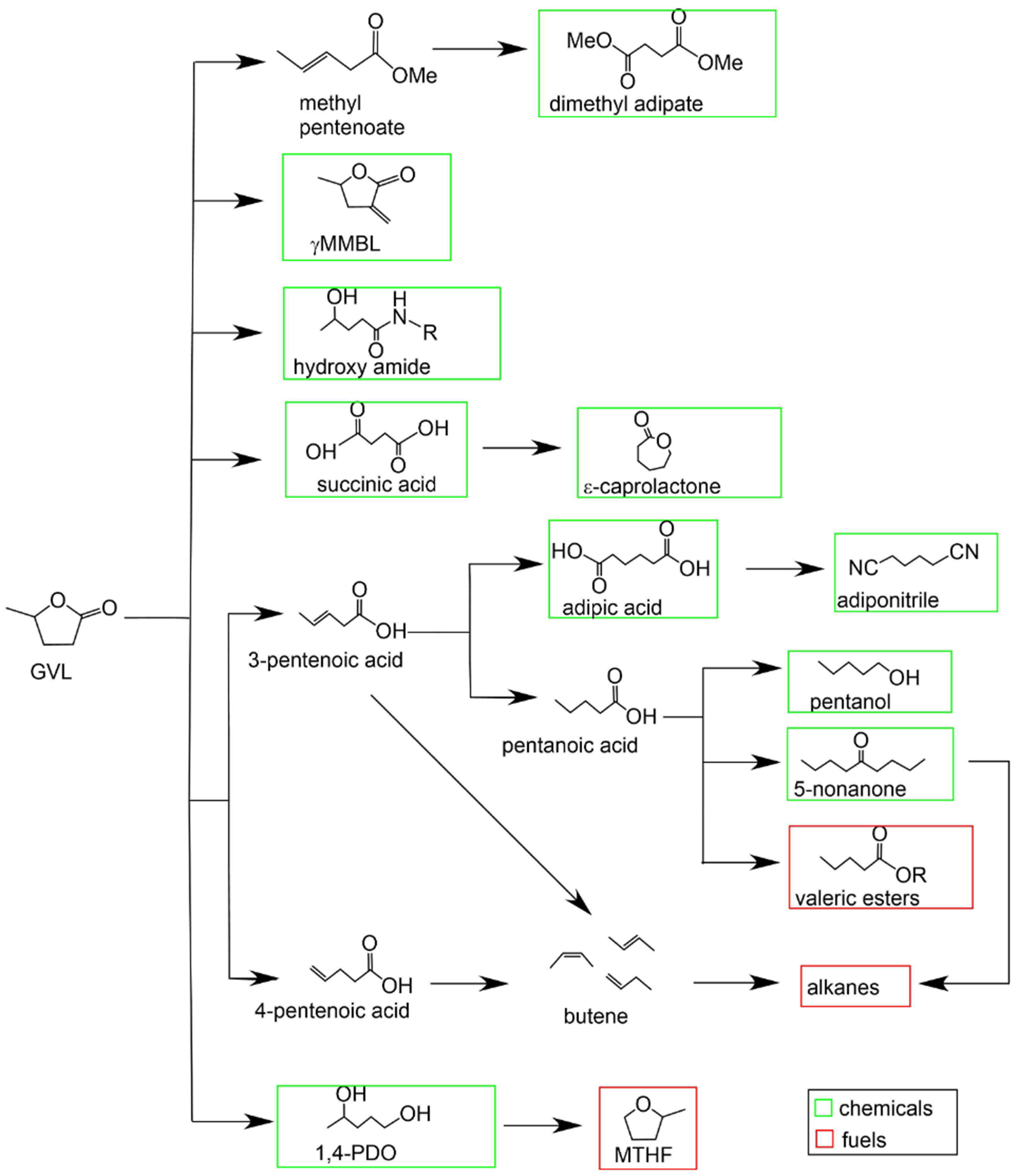 Figure 1. Conventional pathway for the conversion of GVL to fuels and chemicals. Reproduced with permission[3]. Copyright John Wiley and Sons. GVL: γ-Valerolactone.