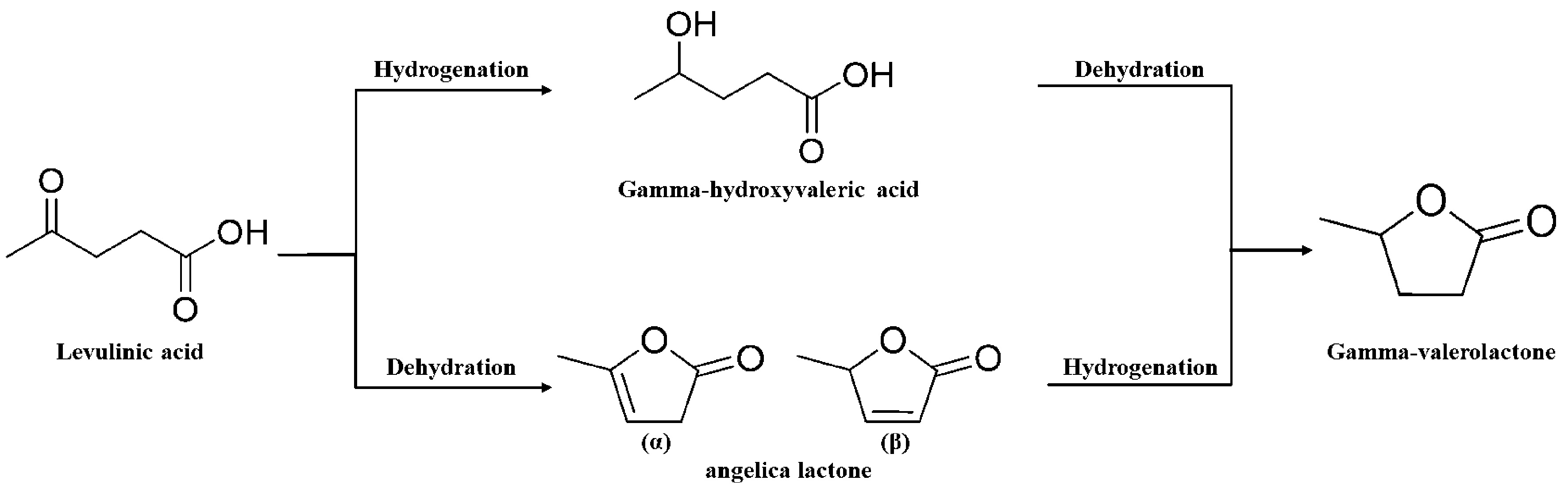 For GVL synthesis, LA undergoes hydrogenation to form γ-hydroxyvaleric acid or its ester, followed by intramolecular dehydration to yield GVL. At temperatures above 180 °C, LA can enolize and form α-angelicolide lactone via intramolecular esterification, which is subsequently hydrogenated to GVL[6] [Figure 4].