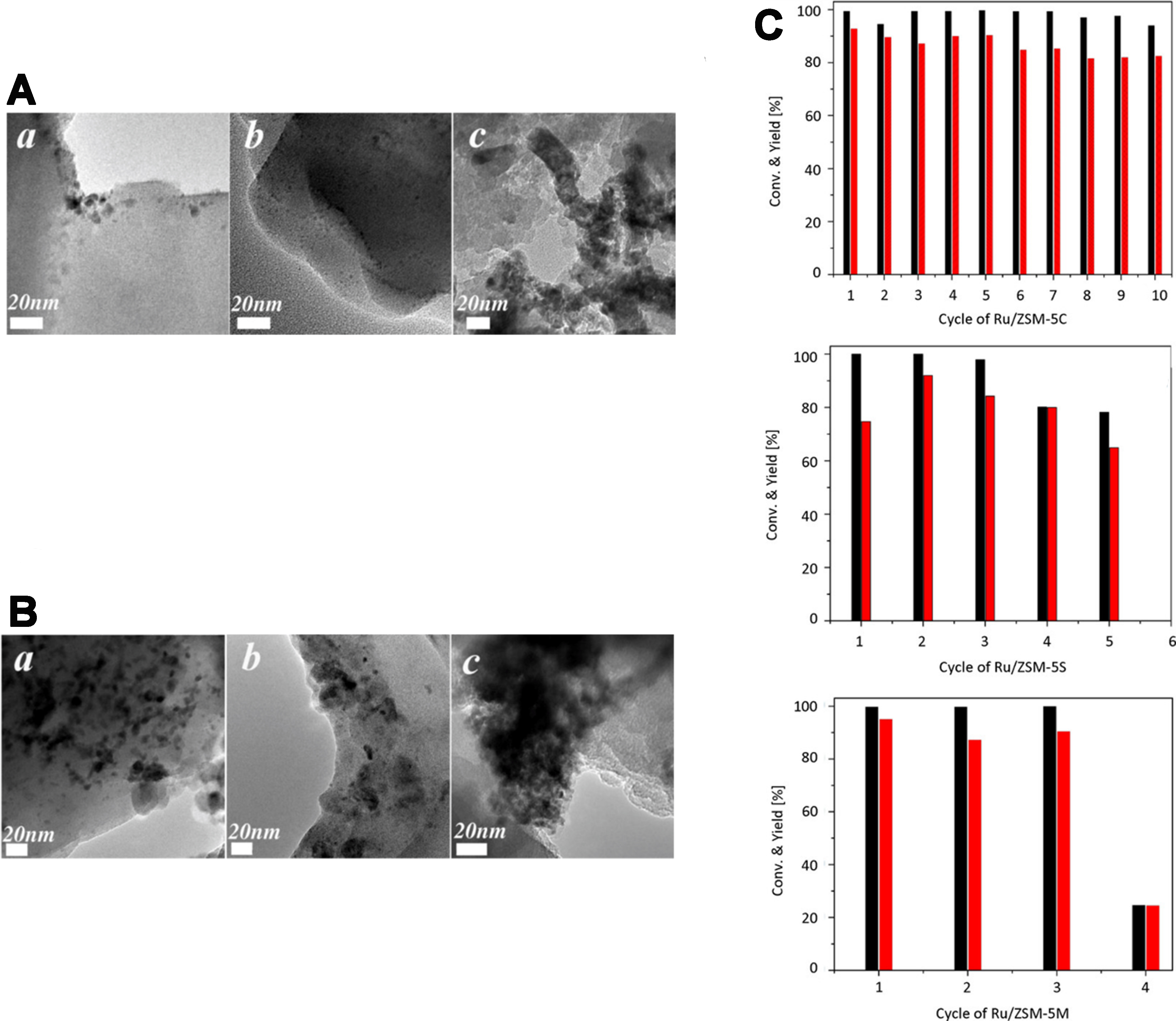Figure 5. (A) TEM images of three fresh catalysts: (a) Ru/ZSM-5C; (b) Ru/ZSM-5S; (c) Ru/ZSM-5M. (B) TEM images of the cycled catalysts: (a) Ru/ZSM-5C; (b) Ru/ZSM-5S; (c) Ru/ZSM-5M. (C) Recycling results for Ru/ZSM-5 catalysts in the hydrogenation of LA. Black: LA conversion and red: GVL yield. Reproduced with permission[45]. Copyright John Wiley and Sons. TEM: Transmission electron microscopy; LA: levulinic acid; GVL: γ-valerolactone.