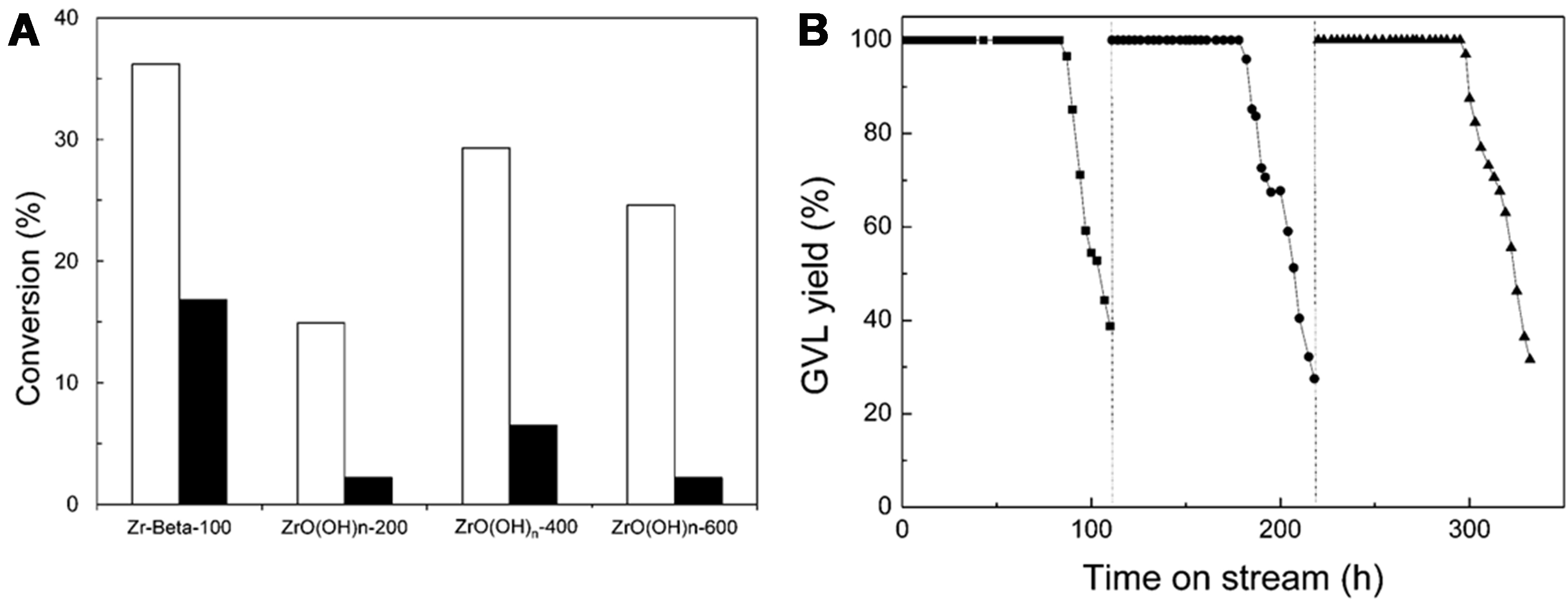 Figure 6. (A) Conversion of methyl levulinate (□) and LA (■) to GVL after 2 h using Zr-Beta-100 and ZrO(OH)n-T as catalysts. Reaction conditions included 1 mmol of substrate, 5 mL of 2-pentanol, 200 mg of catalyst, and a temperature of 118 °C; (B) GVL yield as a function of time for the MPV reaction of LA over Zr-Beta-100 at 250 °C in a continuous flow reactor, with a WHSV of 0.64 h-1. The catalyst was regenerated at 110 and 218 h. Reproduced with permission[40]. Copyright Royal Society of Chemistry. LA: Levulinic acid; GVL: γ-valerolactone; MPV: Meerwein-Ponndorf-Verley; WHSV: weight hourly space velocity.
