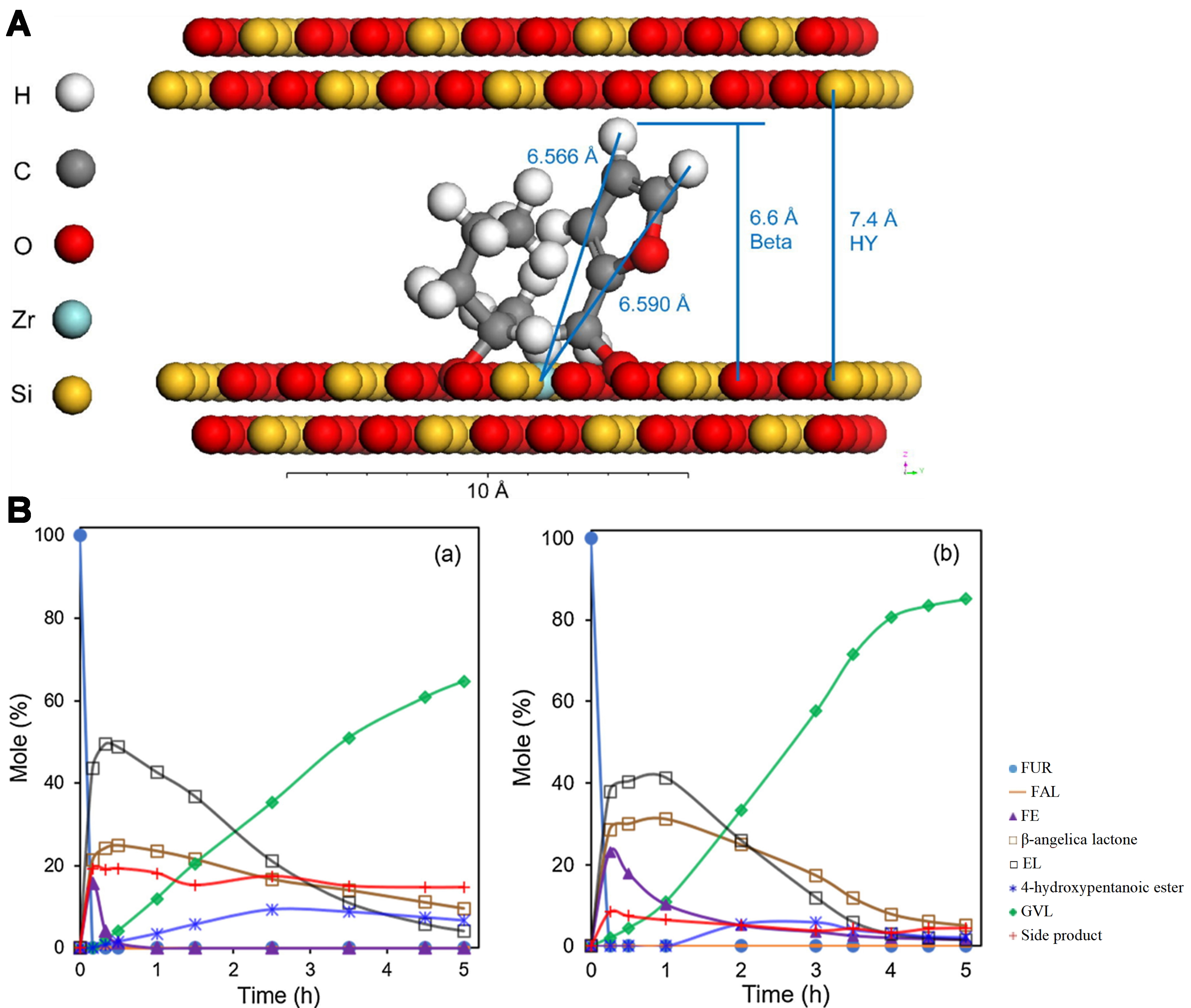Zr-based catalysts are also widely used in biomass conversion and have proven highly effective in GVL synthesis when combined with zeolites. Wang et al. synthesized highly stable and reactive Zr-Beta and Zr-Al-Beta zeolites, achieving over 96% GVL selectivity in batch reactors and more than 99% yield in continuous flow reactors[40]. The high activity is attributed to moderately strong Lewis acid sites, which are resistant to deactivation by acidic reactants. This stability enables their long-term use with minimal performance degradation[40] [Figure 6].