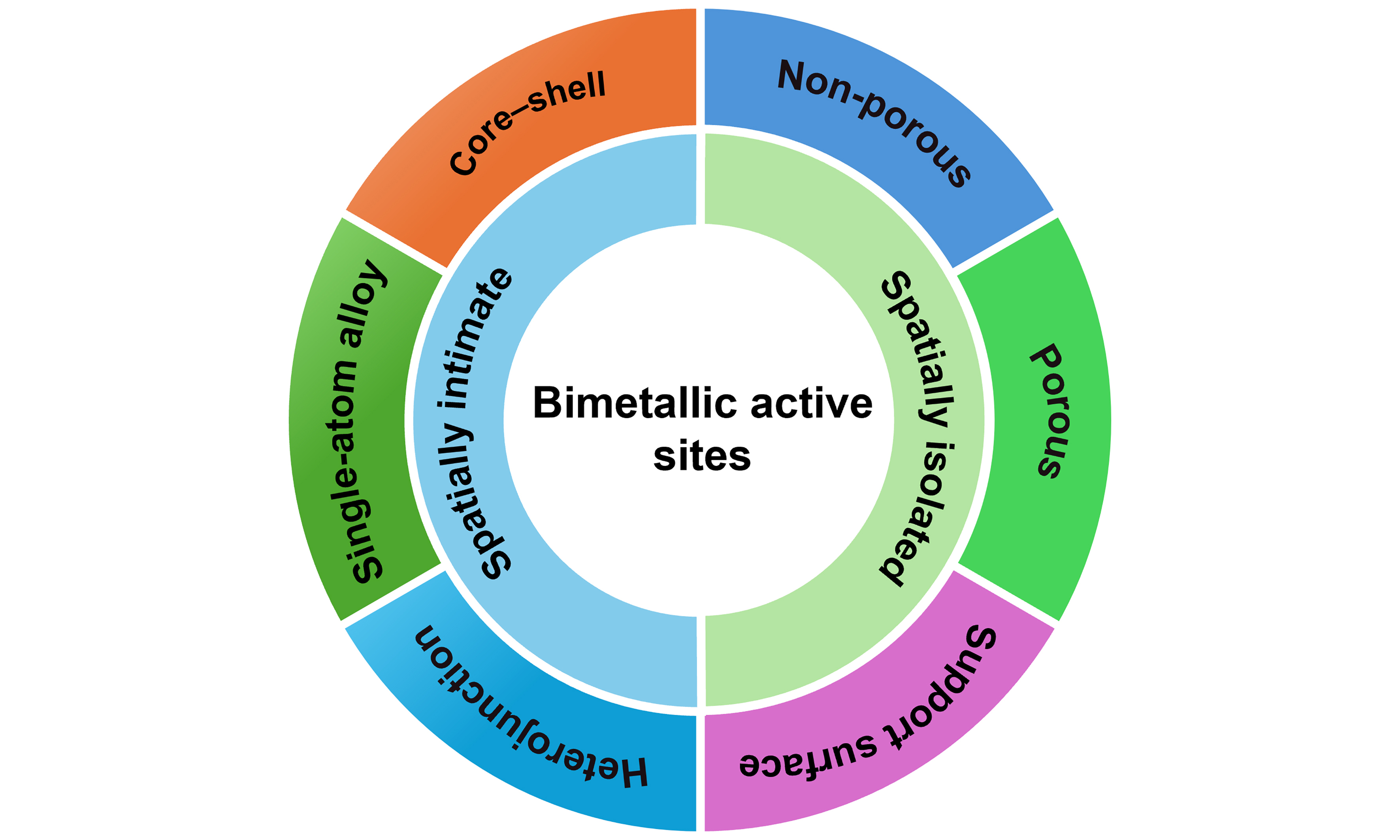 Scheme 2. Structure diagram of heterogeneous catalysts with bimetallic active sites. Typical spatial configurations encompass both the spatially intimate bimetallic active sites (including core-shell, single-atom alloy, and heterojunction) and the spatially isolated bimetallic active sites (including isolated by non-porous materials, isolated by porous materials and support surface).