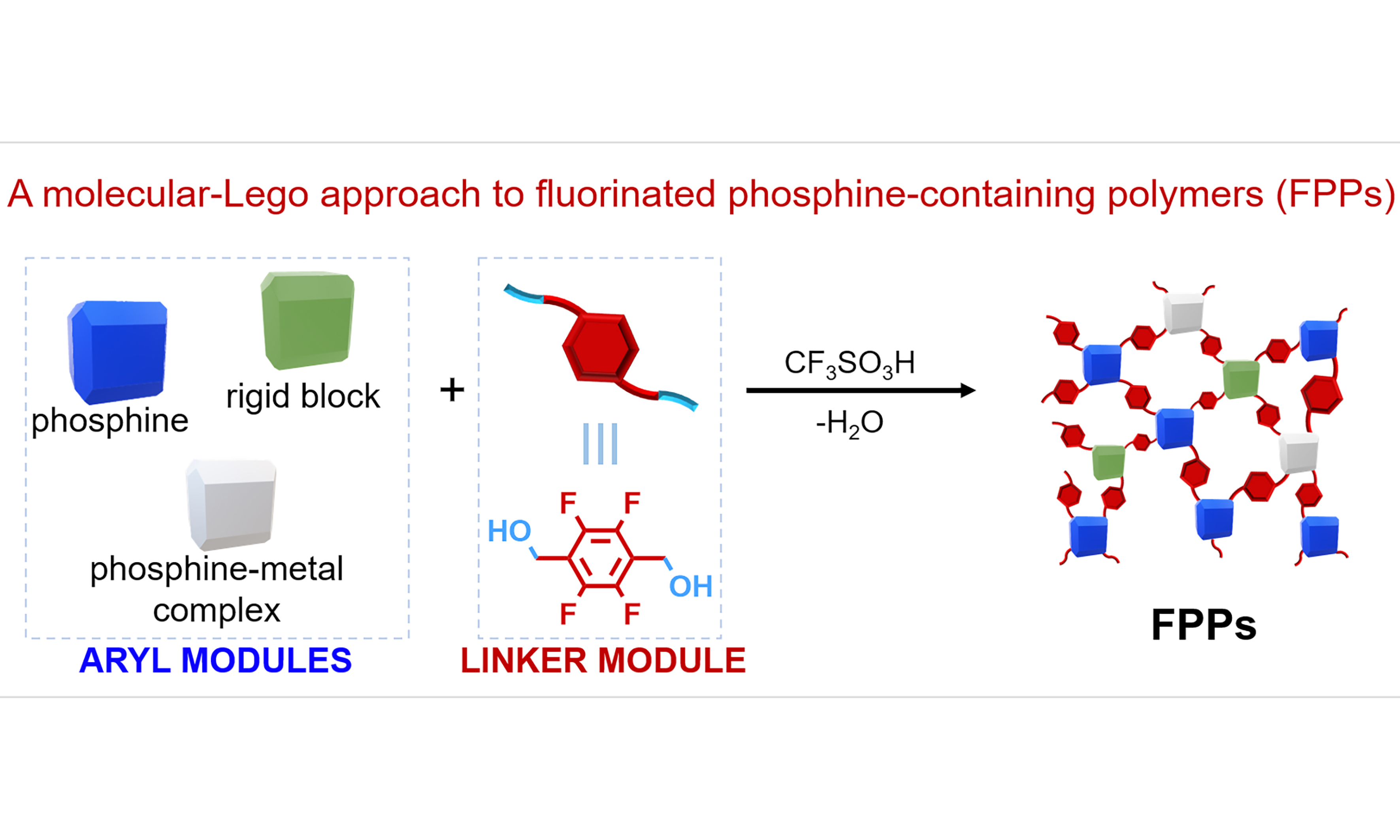 This research breaks through the conventional limitations in synthesizing phosphorus-containing porous polymers by achieving direct molecular Lego-like assembly of phosphine ligands or metal complexes, linker monomer and comonomers via Brønsted acid catalysis. This method demonstrates broad compatibility with commercially available phosphine compounds, including monodentate/bidentate phosphine ligands and metal-phosphine complexes bearing aryl substituents, all of which can be successfully incorporated into FPPs with good yields. Notably, the pore architectures of resulting FPPs can be precisely tailored through modular copolymerization with tunable building blocks. Moreover, the FPPs catalyst demonstrates excellent CO2 adsorption performance and displays high activity, good structural stability and broad alkylamine compatibility in N-formylation. In summary, this “molecular Lego” strategy not only streamlines material preparation but also pioneers a new approach for designing phosphine-based heterogeneous catalysts.