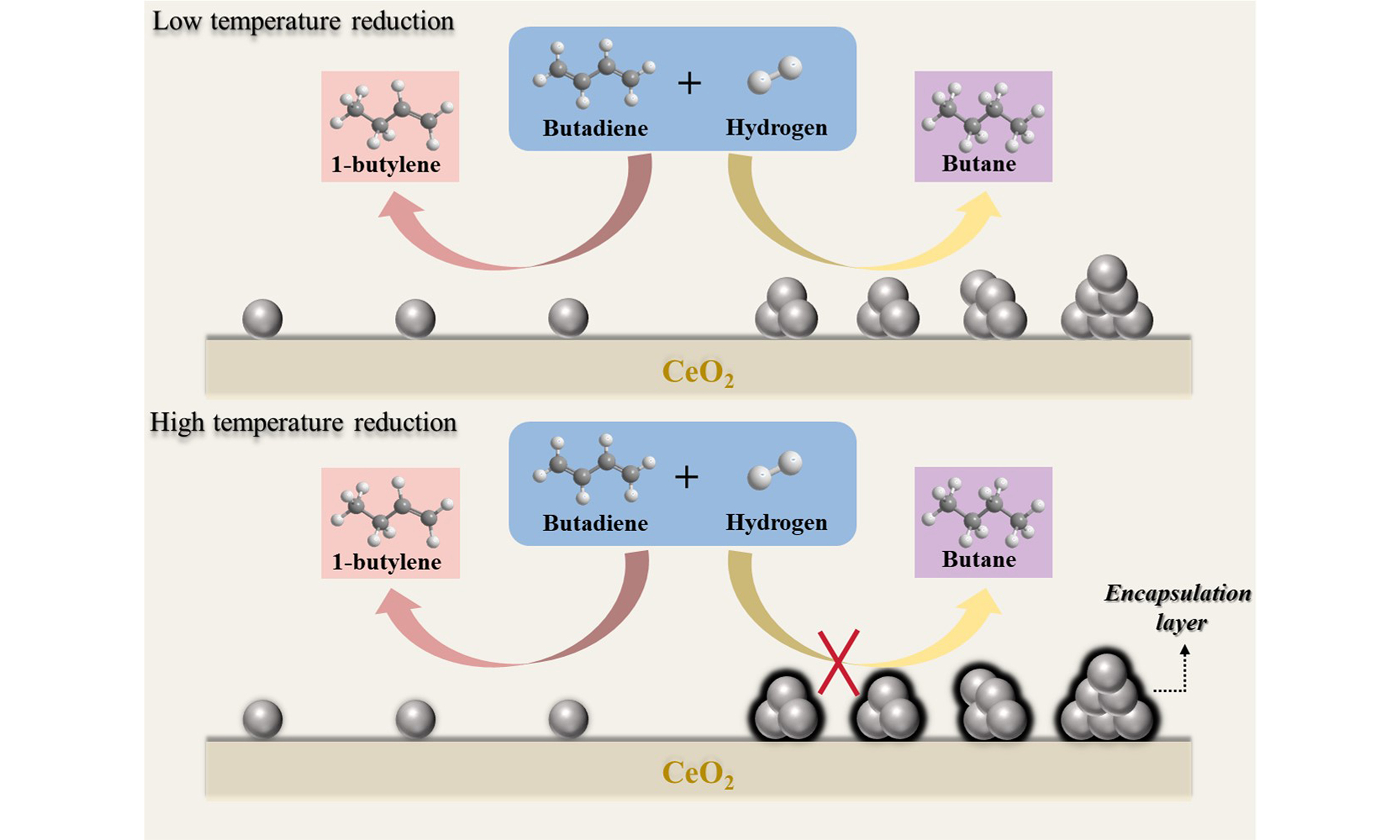 Fluidized catalytic cracker (FCC) unit is a significant processing segment in the petroleum refinery process for the production of light olefins from crude oil, especially C4 cuts, such as 1-butene and isobutenes[1]. Subsequently, the refined C4 olefins can either be converted to longer-chain linear alpha olefins via oligomerization process for producing the versatile plasticizer alcohols[2,3] or be directly valorized into value-added ethers or alcohols[4]. However, during the above upgrading processes, the concomitant 1,3-butadiene by-products originating from the FCC unit can cause intractable issues of catalyst deactivation for the downstream processes due to the formation of undesirable oligomers or polymers[5]. Thereupon, the concentration of 1,3-butadiene should be rigorously controlled below 200 ppm. To this end, one effective strategy is the selective hydrogenation of 1,3-butadiene to butenes[6]. In general, Pd-based catalysts are widely applied in this field due to their intrinsically high hydrogenation activity[7-11]. Nevertheless, Pd monometallic catalysts often suffer from low alkene selectivity at high conversions while the bimetallic counterparts require precisely manipulating the compositions of the active sites and phase of catalytic supports for attaining high alkene selectivity, thus posing challenges for the potential large-scale utilization.