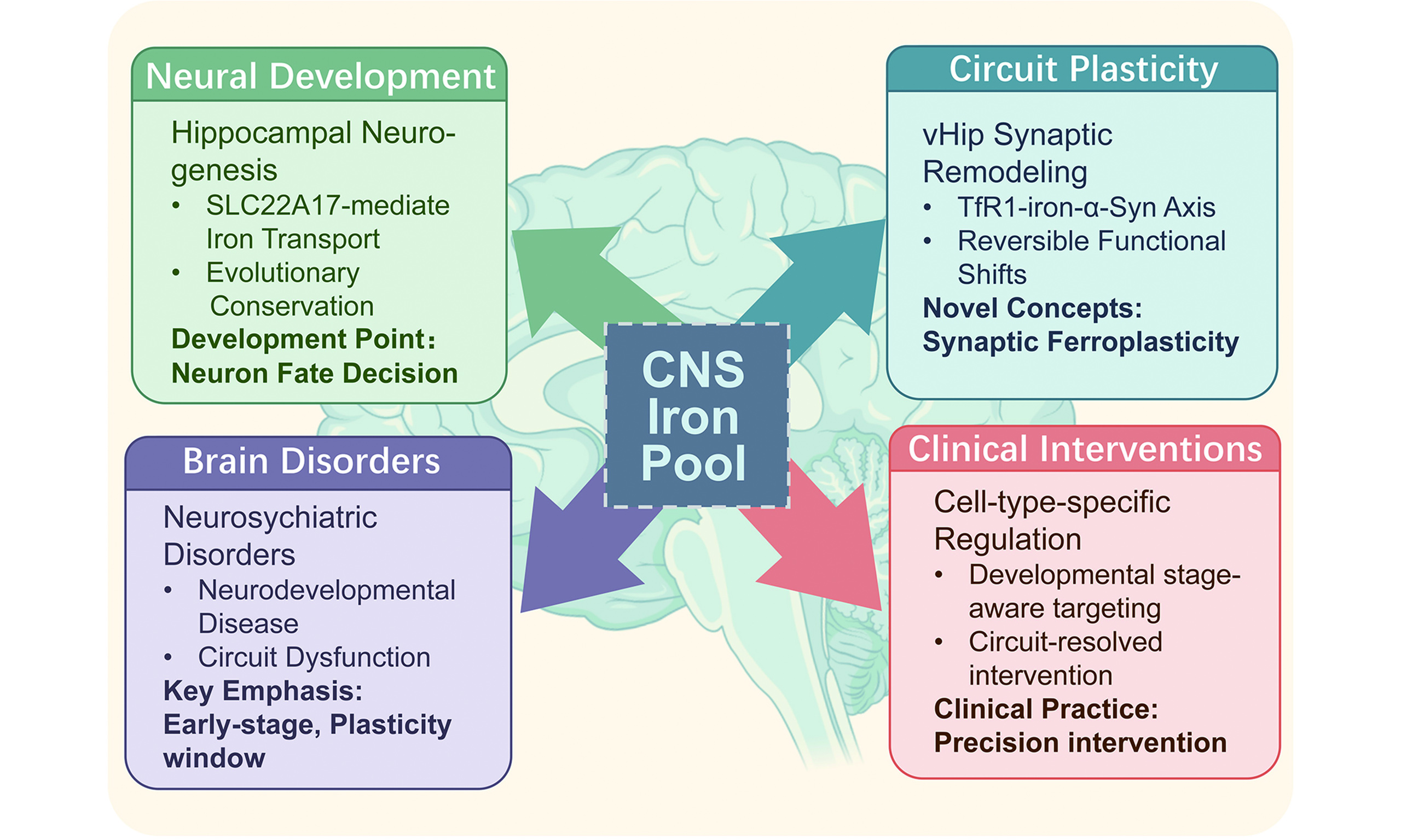 Iron is one of the most extensively studied metallic elements in the central nervous system (CNS). Research conducted in invertebrates, such as fruit flies, first established the role of iron in neurogenesis and development. However, studies in this field have failed to effectively integrate developmental and pathophysiological contexts within a coherent framework, instead focusing on isolated neurodegenerative diseases or discrete molecular pathways[1]. There remains a critical knowledge gap regarding how iron dynamics are spatiotemporally coordinated across the CNS throughout the lifespan. Recent advances in single-cell omics and neural circuit science have revealed the limitations of traditional models and necessitate a cross-scale reassessment. Our aim is to establish a unified framework that integrates molecular signaling with circuit-level function, thereby reconciling conflicting findings and establishing iron as a central, evolutionarily conserved regulator of CNS health and disease.