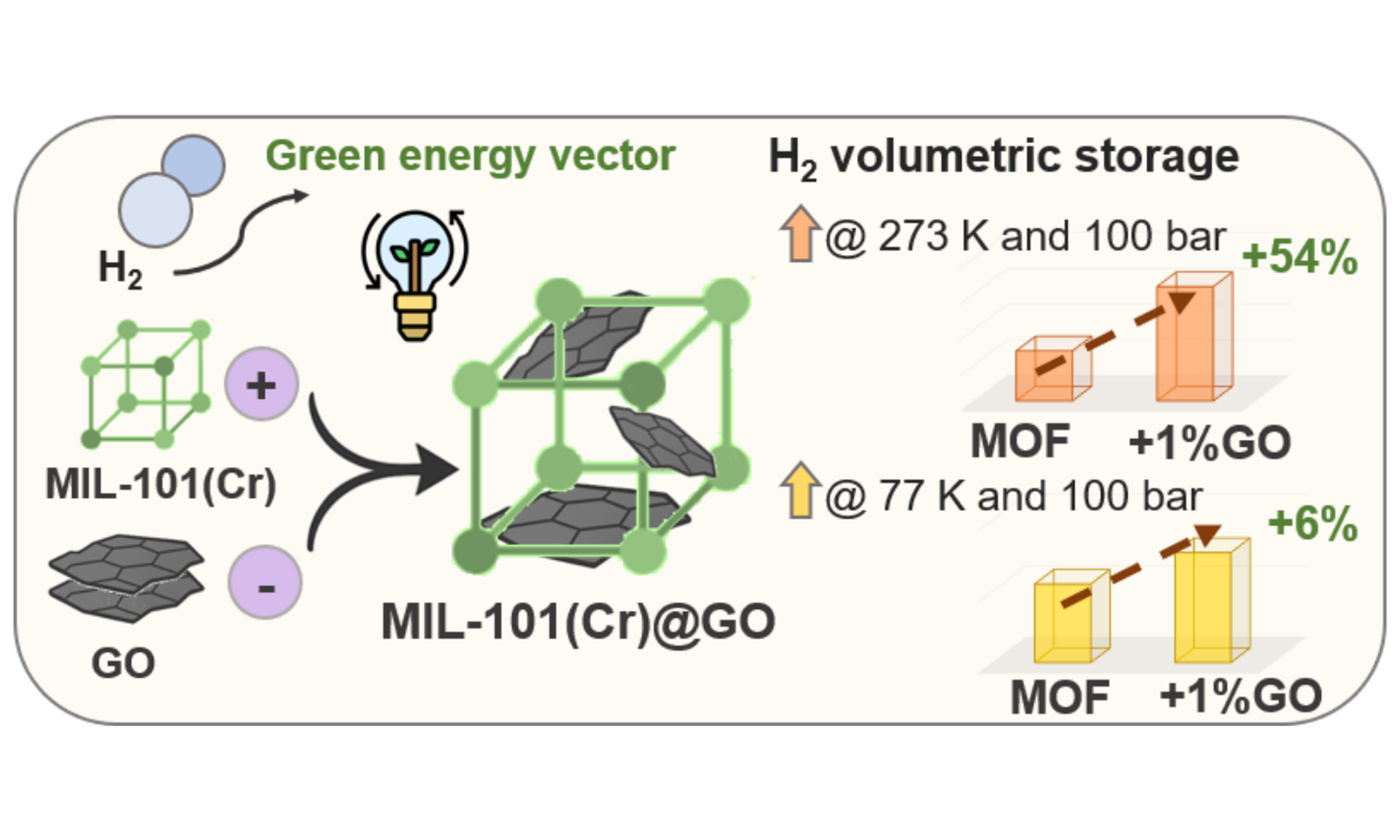 Hydrogen (H2) is a clean and high-energy carrier; however, its low volumetric energy density remains a major barrier to practical storage and transport. This study demonstrates that the hybridization of MIL-101(Cr) with graphene oxide (GO) effectively enhances H2 storage and release capacities. The integration of GO, with a density of 450 kg m-3, into MIL-101(Cr), a highly porous metal-organic framework (ABET ≥ 3,500 m2 g-1, Vpore ≥ 2.0 cm3 g-1 and 259 kg m-3 of density) was investigated through a post-synthetic hybridization strategy, leading to increased ultra-microporosity and enhanced density of the resulting hybrids. Although GO incorporation led to a reduction in gravimetric (wt.%) H2 storage at 77 K and 100 bar, ranging from 3% to 36% as GO content increased, it significantly improved H2 uptake at 273 K and 100 bar. The hybrid with 1 wt.% GO exhibited the most notable enhancement, achieving a 40% increase in gravimetric storage capacity (273 K, 100 bar) compared to pure MIL-101(Cr). This hybrid also demonstrated superior volumetric performance, reaching a 6% increase both in total H2 storage, 35.8 kg m-3 (77 K, 100 bar), and deliverable capacity, 34.2 kg m-3, under practical operating conditions (i.e., charging: 77 K and 100 bar; discharging: 160 K and 5 bar). These findings highlight the dual role of GO: densifying the composite while potentially introducing ultramicroporosity, particularly effective at elevated temperatures, offering a promising pathway toward practical, scalable, and efficient hydrogen storage systems.