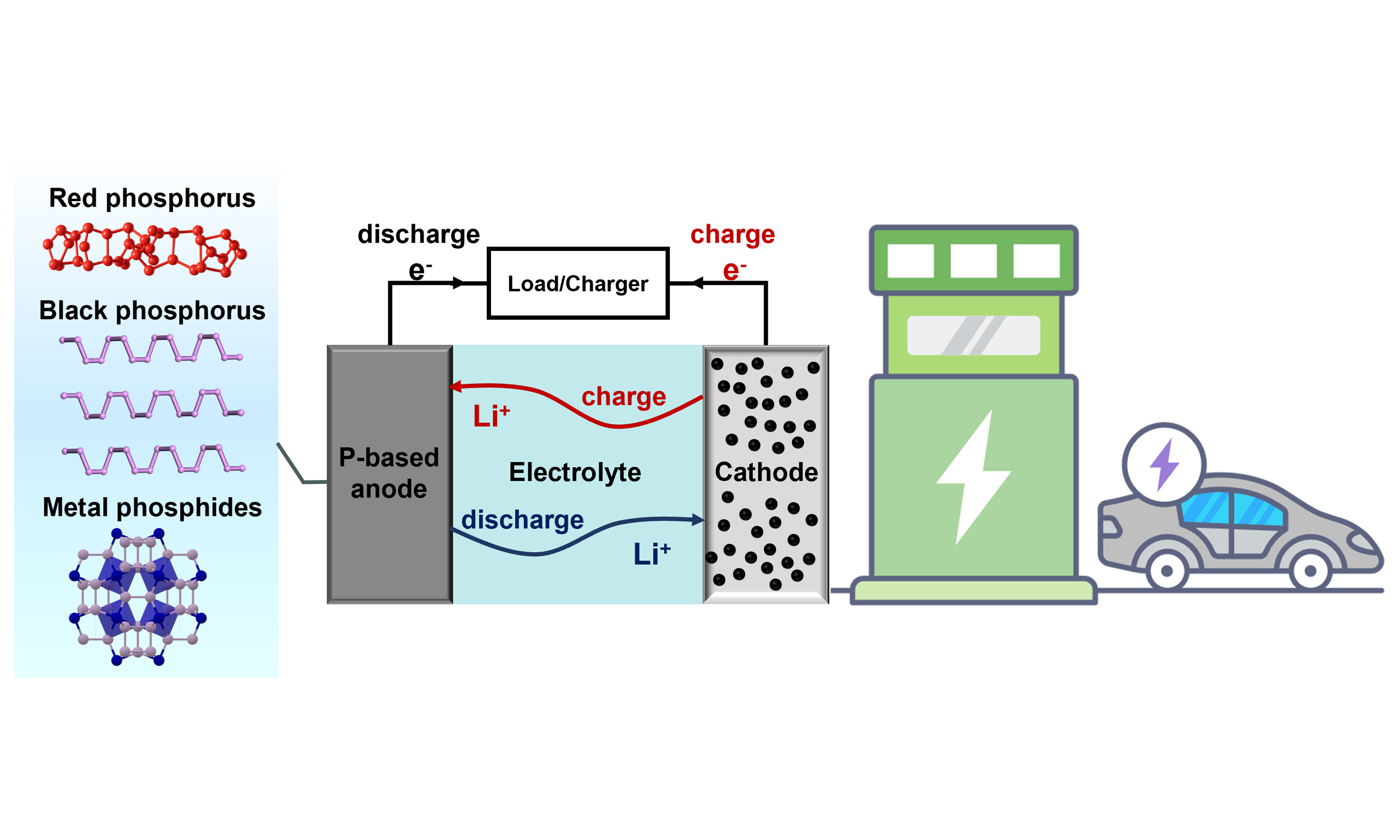 This review systematically discusses recent advances in the development of P-based anodes for fast-charging LIBs. It begins with an introduction of the fundamental physical and chemical properties and lithium storage mechanisms of both elemental P allotropes and TMPs. Then, the critical challenges that hinder the practical deployment of P-based anodes are summarized, followed by an in-depth analysis of major optimization strategies. Finally, future research directions are proposed to address the remaining bottlenecks, aiming at guiding the rational design of scalable and durable P-based anodes for