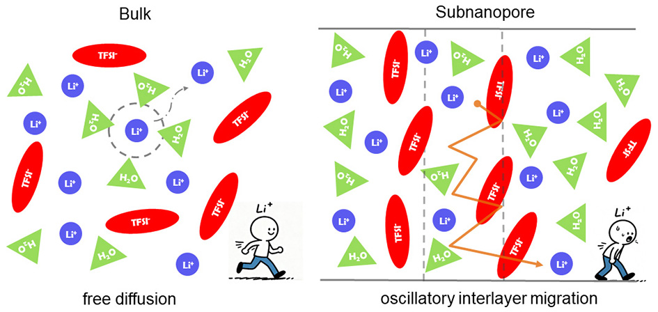 In summary, we used CPM-MD simulations to investigate the ion transport and charging dynamics mechanisms in LiTFSI electrolytes within subnanopore. Our results suggested that the electrolyte in subnanopore was compressed from a three-dimensional bulk phase into a two-dimensional arrangement on account of the confined space. Thus, the coordination number of solvated water surrounding Li+ and TFSI- in dilute solutions was reduced by nanoconfinement. With increasing concentration, the electrolyte within subnanopore was progressively organized into an ordered and layered structure. Due to the pronounced layering that reduced the spacing between Li+ and surrounding water molecules, enhanced solvation of Li+ was observed at a concentration of 21 m. To be more specific, this layered structure confined ions between interlayers, requiring them to overcome energy barriers for migration. The ion transport mechanism thereby shifted from free diffusion to oscillatory interlayer migration, which severely suppressed ion mobility within the subnanopore.