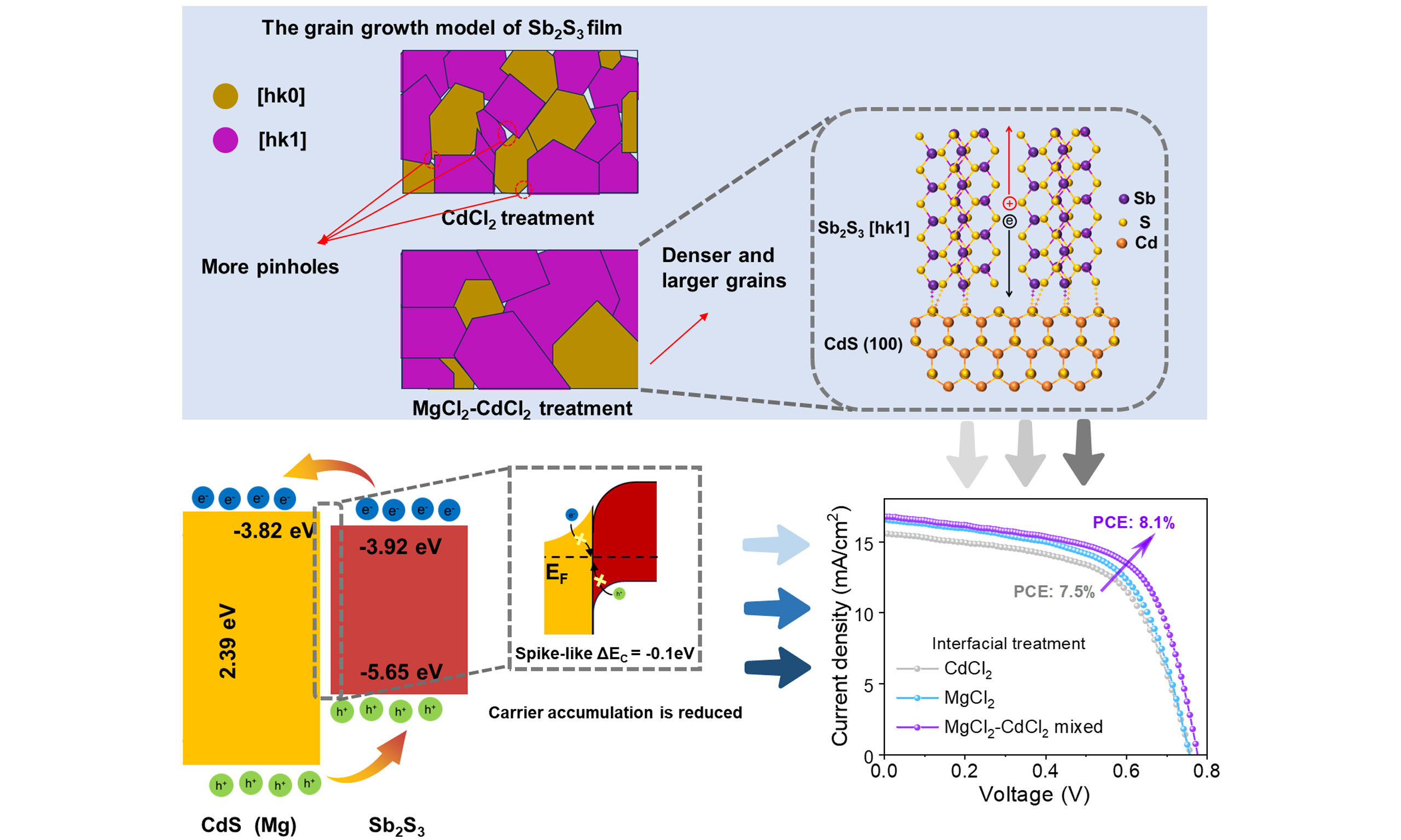 In summary, we develop a MgCl2-CdCl2 mixed interfacial treatment, enabling bidirectional optimization of the CdS/Sb2S3 heterojunction interface for efficient Sb2S3 thin film solar cells. This treatment effectively reduces parasitic absorption of the CdS film in the short-wavelength (300-500 nm) range, thereby enhancing the photon-harvesting efficiency of the absorber. Additionally, the improved surface quality of the CdS film enables the deposited Sb2S3 film to exhibit a significantly larger grain size, thereby reducing defects. Compared to the conventional CdCl2-treated CdS film, the MgCl2-CdCl2 mixed treatment introduces Mg2+ doping in the CdS layer, adjusting the interfacial energy band alignments. The enhanced surface potential and reduced SPV of the CdS film suppress surface defects. The CdS/Sb2S3 heterojunction interface achieves a transform from “cliff” to “spike” energy band structure and a small CBO (-0.1 eV), improving carrier separation efficiency. Based on these synergistic effects, the MgCl2-M device with a smaller J0 and a large Vbi reveals a high-quality heterojunction. By temperature-dependent VOC characterization, the optimal device Ea of 1.63 eV approaches the bandgap, resulting in effective suppression of nonradiative recombination. The champion Sb2S3 solar cell based on MgCl2-CdCl2 mixed treatment achieves a PCE of 8.1%, with a VOC of