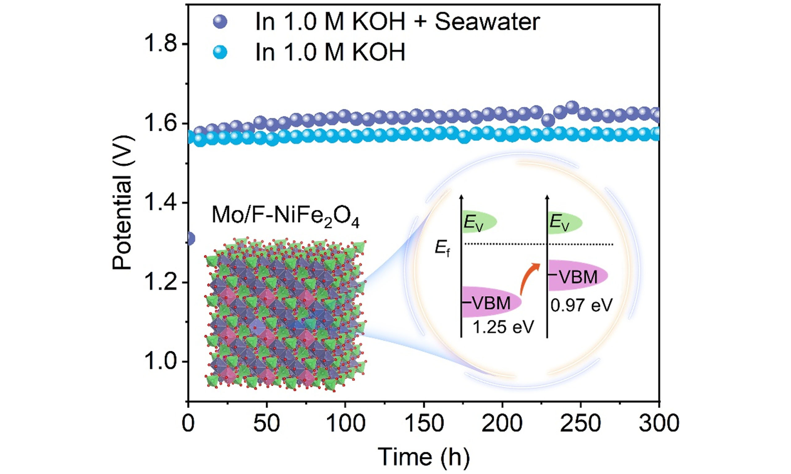 In summary, Mo/F-NiFe2O4 was successfully constructed for the OER in alkaline media. Mo/F co-doping modulated the electronic structure, increased Ni/Fe oxidation states, and shifted the VBM upward, inducing electron redistribution and weakening metal-oxygen bonds, thereby facilitating M-O bond formation and cleavage during catalysis. Furthermore, Mo/F-NiFe2O4 catalyst effectively activated LOM, leading to accelerated reaction kinetics and enhanced intrinsic activity. Owing to these synergistic effects, the optimized Mo/F-NiFe2O4 catalyst delivered a low overpotential of 247 mV at 50 mA cm-2, and outstanding long-term stability over 130 h at 100 mA cm-2, surpassing both pristine NiFe2O4 and single-doped counterparts. Practical water-splitting in both alkaline and alkaline seawater demonstrated improved activity and stability. This work shows case insights into how dual anion-cation co-dopants in regulating lattice oxygen participation in the OER, offering valuable guidance for practical water electrolysis applications.