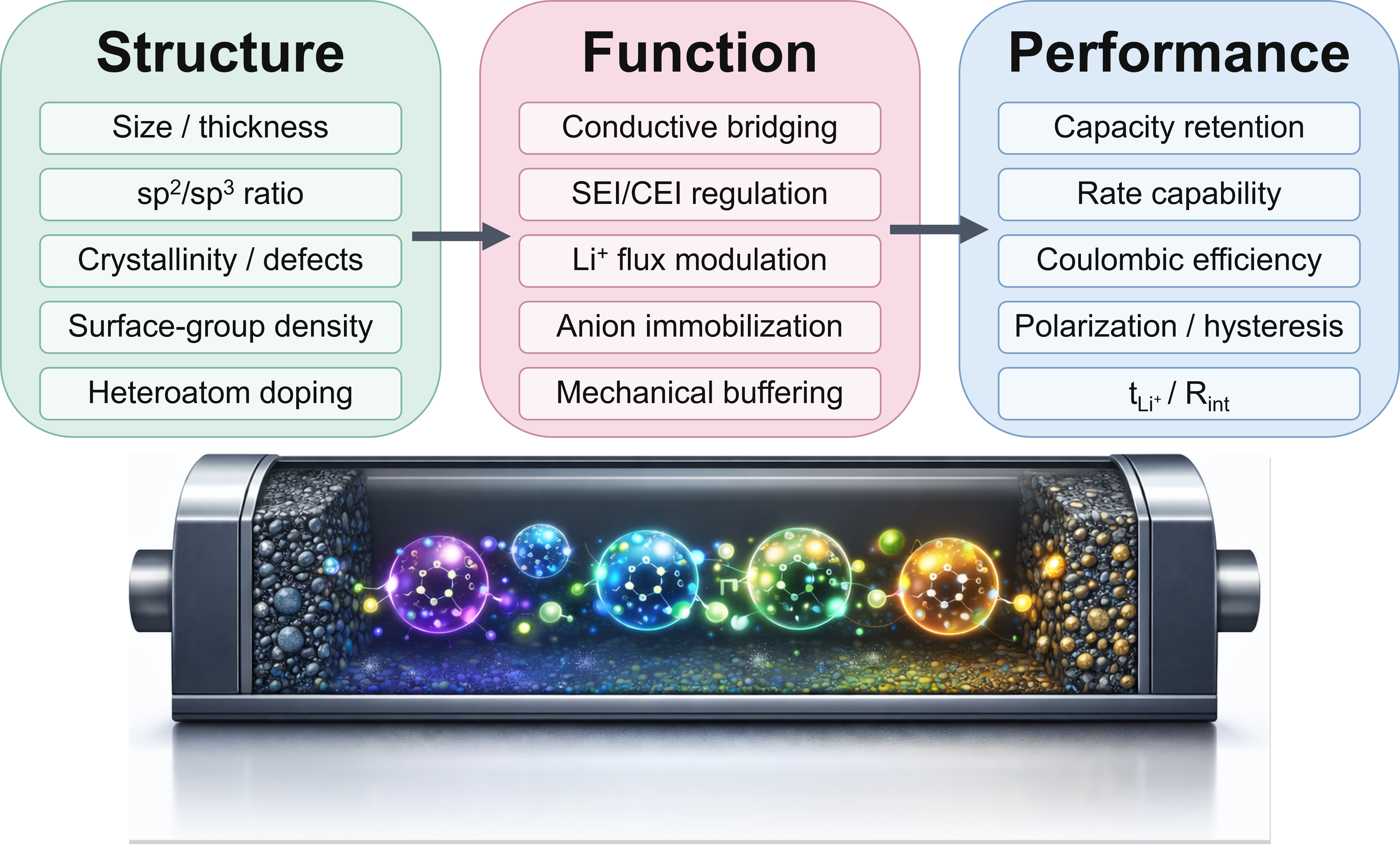 Despite rapid progress, a major bottleneck remains: establishing quantitative relationships among CD synthesis, structure, and battery performance, especially through interfacial mechanisms. To translate fragmented reports into actionable design principles, this review is organized according to a Structure-Function-Performance (S-F-P) framework [Figure 3] for lithium-based batteries, connecting (i) CD structural parameters (size, sp2/sp3 ratio, crystallinity/defect density, surface group density/charge, and heteroatom doping) to (ii) battery-relevant interfacial functions (conductive bridging, SEI/cathode electrolyte interphase (CEI) regulation, Li+ transport modulation/anion immobilization, and mechanical buffering), and ultimately to (iii) measurable electrochemical metrics (capacity retention, rate capability, Coulombic efficiency, polarization, lithium ion transference number (tLi+), and interfacial resistance).