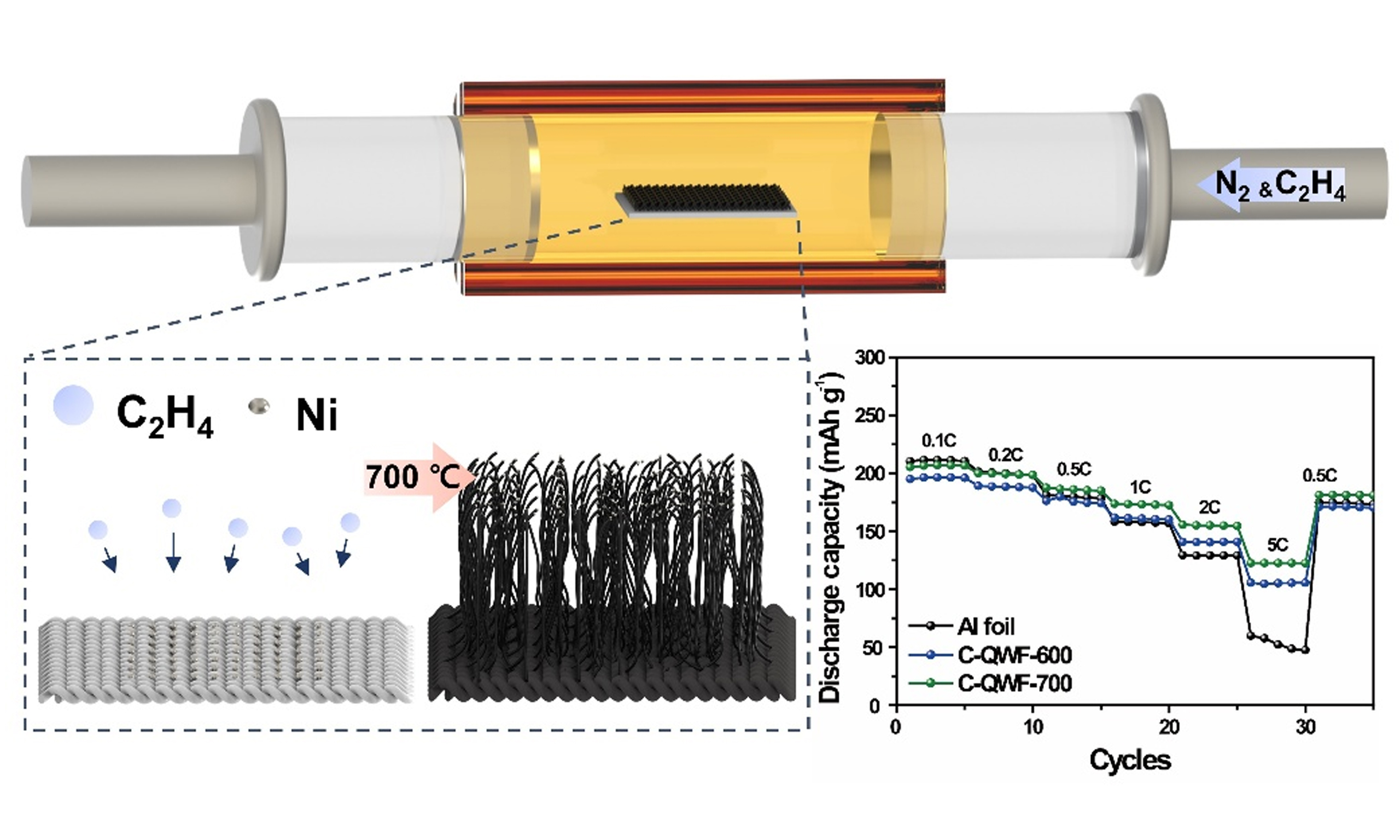 In this study, we propose and demonstrate a multifunctional electrode architecture based on CNT-integrated QWFs for application in structural LIBs. CNTs were directly synthesized on SiO2 fabrics via a CVD process using nickel as a catalyst layer[24-27]. This integration significantly improves the electrical conductivity and active surface area of the electrode, enabling enhanced electrochemical performance. Specifically, the CNT layer facilitates efficient charge transport and provides a robust scaffold for active material deposition, allowing for higher areal loading and improved energy density. Compared to conventional aluminum foil-based current collectors, the CNT-QWF electrode demonstrates comparable or superior electrochemical performance while offering added mechanical functionality. Furthermore, we explore the effect of CVD process conditions on CNT morphology and electrode performance. Through systematic optimization, we show that CNTs grown at optimal conditions result in enhanced capacity retention, rate capability, and cycling stability. Additionally, the unique morphology of the CNT-coated fabric allows for reduced usage of traditional conductive agents, potentially lowering production costs and increasing the mass fraction of active materials. This work presents a scalable and effective approach for fabricating structurally integrated electrodes that meet the dual requirements of mechanical strength and electrochemical performance. The C-QWF-700-based electrode presents a viable alternative to conventional metal foils, combining mechanical robustness with sufficient electrochemical performance for structural battery applications. The findings offer insights into the design of next-generation structural batteries and open new avenues for integrating energy storage functions into load-bearing materials for lightweight, high-efficiency systems.