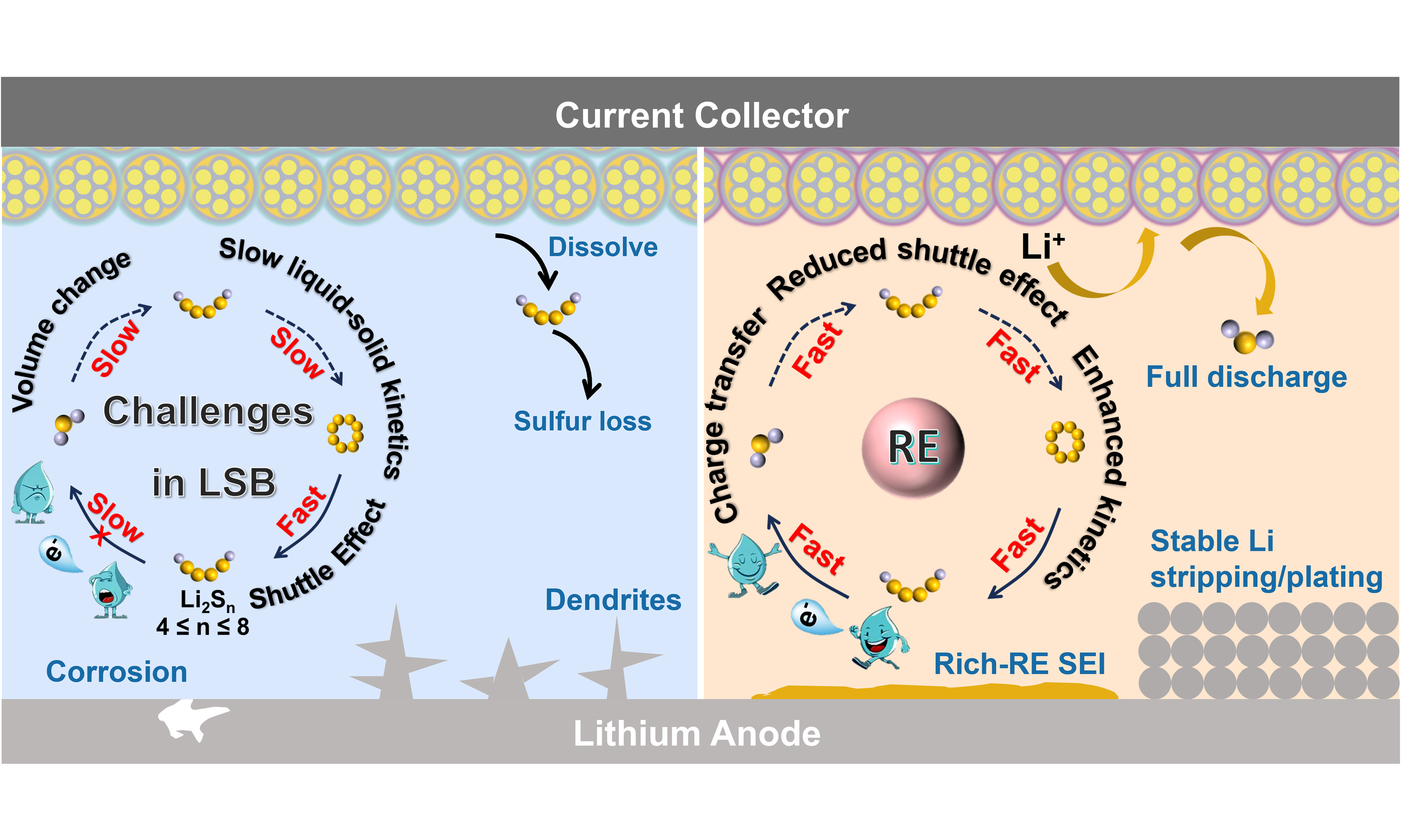 Herein, we present a comprehensive review of recent advances in RE-based functional materials for LSBs. We systematically summarize the structural features, chemical states, and synthesis strategies of RE compounds and elucidate the mechanisms by which they enhance electrochemical performance. The discussion is organized by battery components: cathode hosts, separators/interlayers, electrolyte additives and interphase regulators, and solid-state electrolytes. We place special emphasis on the multifaceted roles of RE elements in immobilizing LiPSs, catalyzing their conversion, facilitating Li+ migration at the anode, and suppressing lithium dendrite growth. We also highlight the contributions of RE-based strategies to LSB development and assess their prospects for future commercialization. We hope this review will inspire new research directions and guide the rational design of RE-based materials to broaden the practical application of LSBs and achieve optimized electrochemical performance.