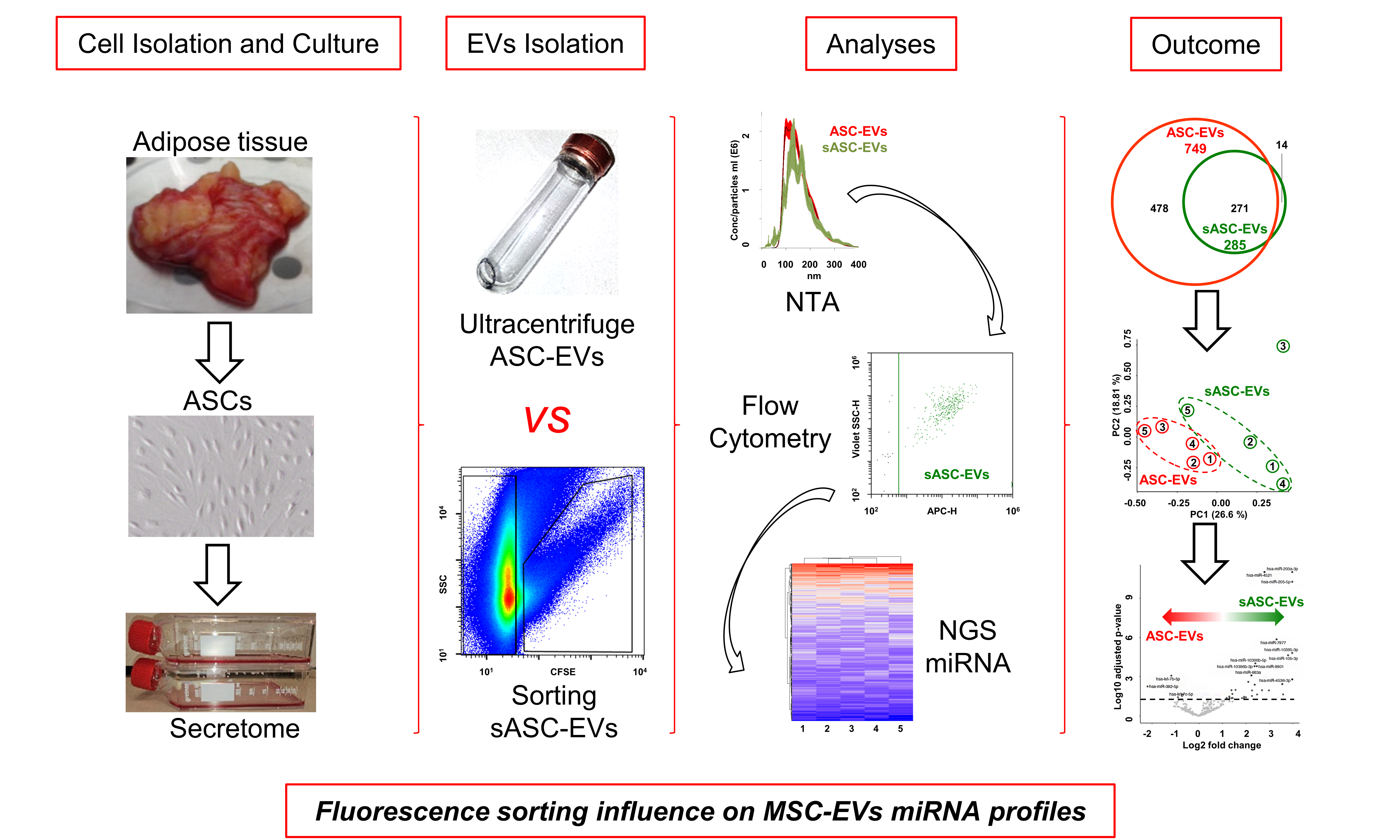 Methods: ASCs from five human donors were characterized by flow cytometry and cultured to collect conditioned media. EV isolation was performed by fluorescence-based sorting using a high-sensitivity cell sorter calibrated for particles ≥ 100 nm. In both ASC-EVs and sorted ASC-EVs (sASC-EVs), EV and MSC markers were analysed by flow cytometry, while size and morphology were assessed via nanoparticle tracking analysis and electron microscopy. Small RNA sequencing was used to profile miRNAs, followed by differential expression and functional enrichment analyses.