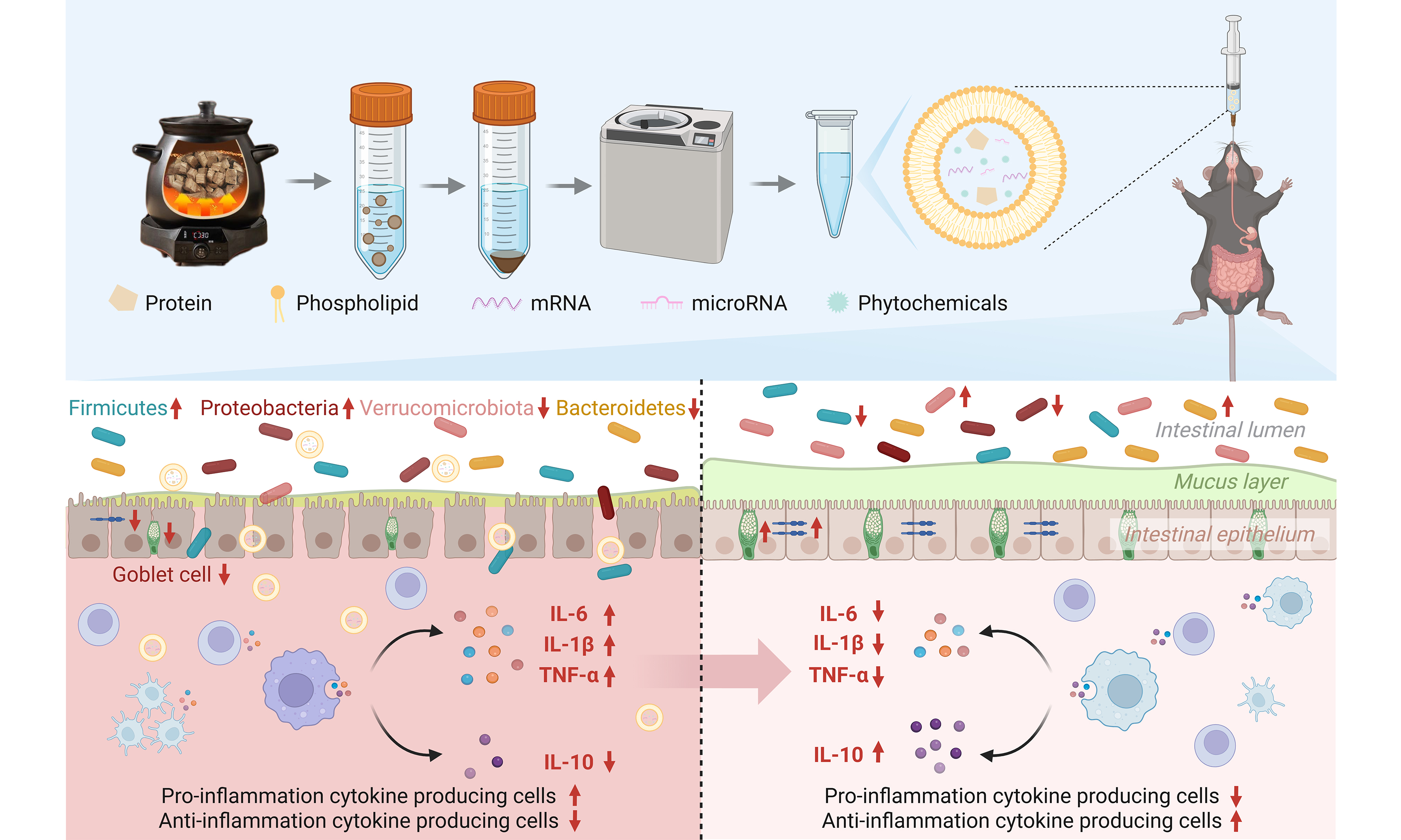 Methods: The GeGen decoction (GGD) was subjected to differential centrifugation following boiling, yielding vesicle-like nanoparticles. Structural analysis confirmed that these nanoparticles have a lipid bilayer and can resist digestion by simulated gastrointestinal fluids. These nanoparticles were administered orally to mice with chronic colitis induced by dextran sulfate sodium to evaluate their therapeutic effects.