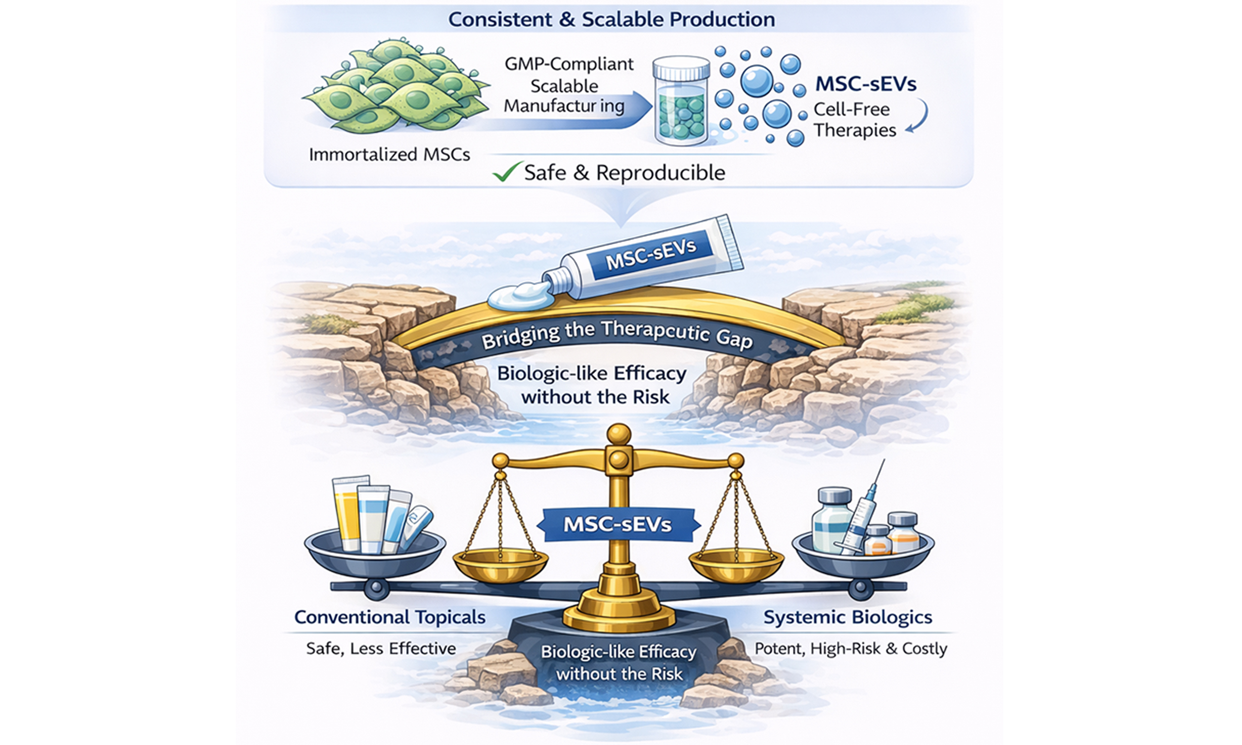 Figure 3. A Cell-Free and Scalable Therapeutic Modality: MSC-sEVs as a New Class of Biologic-Inspired Therapeutics. This graphical abstract illustrates the unique advantages of MSC-sEVs as cell-free, biologic-inspired therapeutics applied topically to psoriatic skin. MSC-sEVs offer localized immunomodulation with minimal systemic exposure, effectively bridging the therapeutic gap in moderate psoriasis. Unlike conventional biologics or live-cell therapies, MSC-sEVs can be manufactured at scale from immortalized monoclonal MSC lines, ensuring product consistency and overcoming donor variability. This platform enables biologic-like efficacy with enhanced safety, accessibility, and scalability. MSCs: Mesenchymal stem cells; sEVs: small extracellular vesicles.