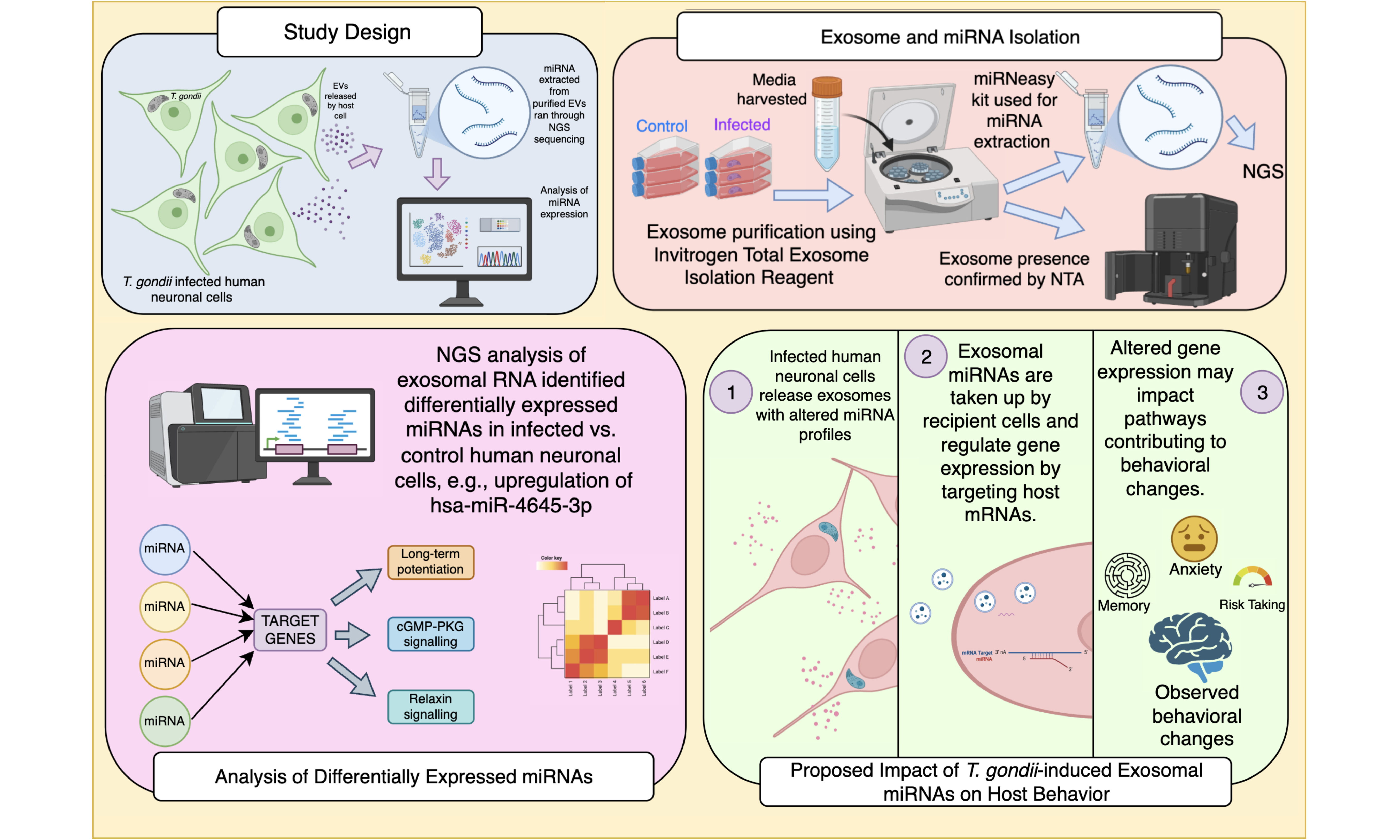 Although these findings provide compelling evidence for the role of EV miRNAs in T. gondii pathogenesis, several questions remain. Firstly, while pathway analysis offers insights into potential functional consequences, direct validation of further miRNA-mRNA interactions is needed in future studies. Further, future research will differentiate EVs originating from infected cells and investigate the mechanisms for sorting the EV miRNAs, for eventual application in development of treatments. Additionally, the downstream phenotypic effects of EV-mediated miRNA transfer warrant further investigation. Given that T. gondii can persist in the CNS for extended periods[5], understanding whether these miRNAs contribute to long-term neurophysiological alterations could have important implications for neuropsychiatric and neurodegenerative disease research. This study identifies a distinct EV miRNA signature associated with T. gondii infection in human neuronal cells.