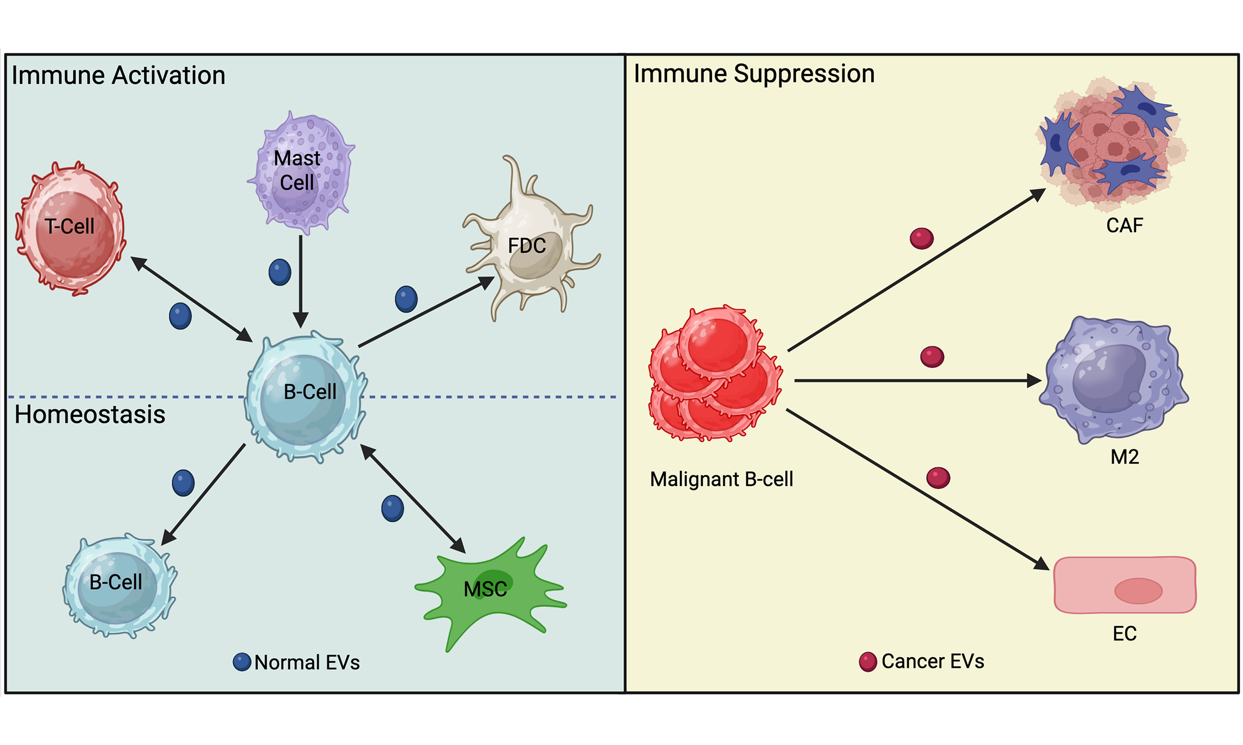 Overall, these data suggest that in situations of normal B cell homeostasis or when the EVs come from primary B cells, they tend to suppress activation and proliferation. In contrast, in the case of an active immune response, EVs form part of a positive feedback loop that includes Mast cells and T cells to further enhance B cell activation and the immune response.