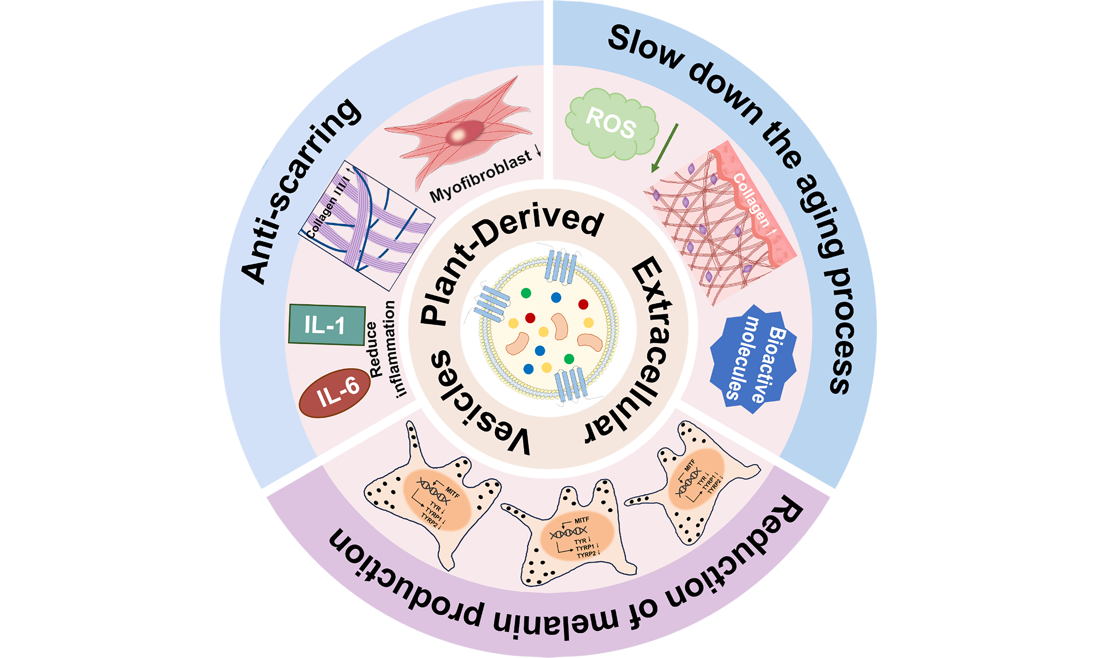 Scarring, skin aging, and hyperpigmentation are among the most frequently encountered concerns in facial aesthetics. As an emerging nanoscale delivery system, PDEVs demonstrate significant potential in facial aesthetics due to their nanoscale structure, high biocompatibility, and low immunogenicity. The anti-scarring, anti-aging, and anti-pigmentation effects of PDEVs are summarized in Table 1.
