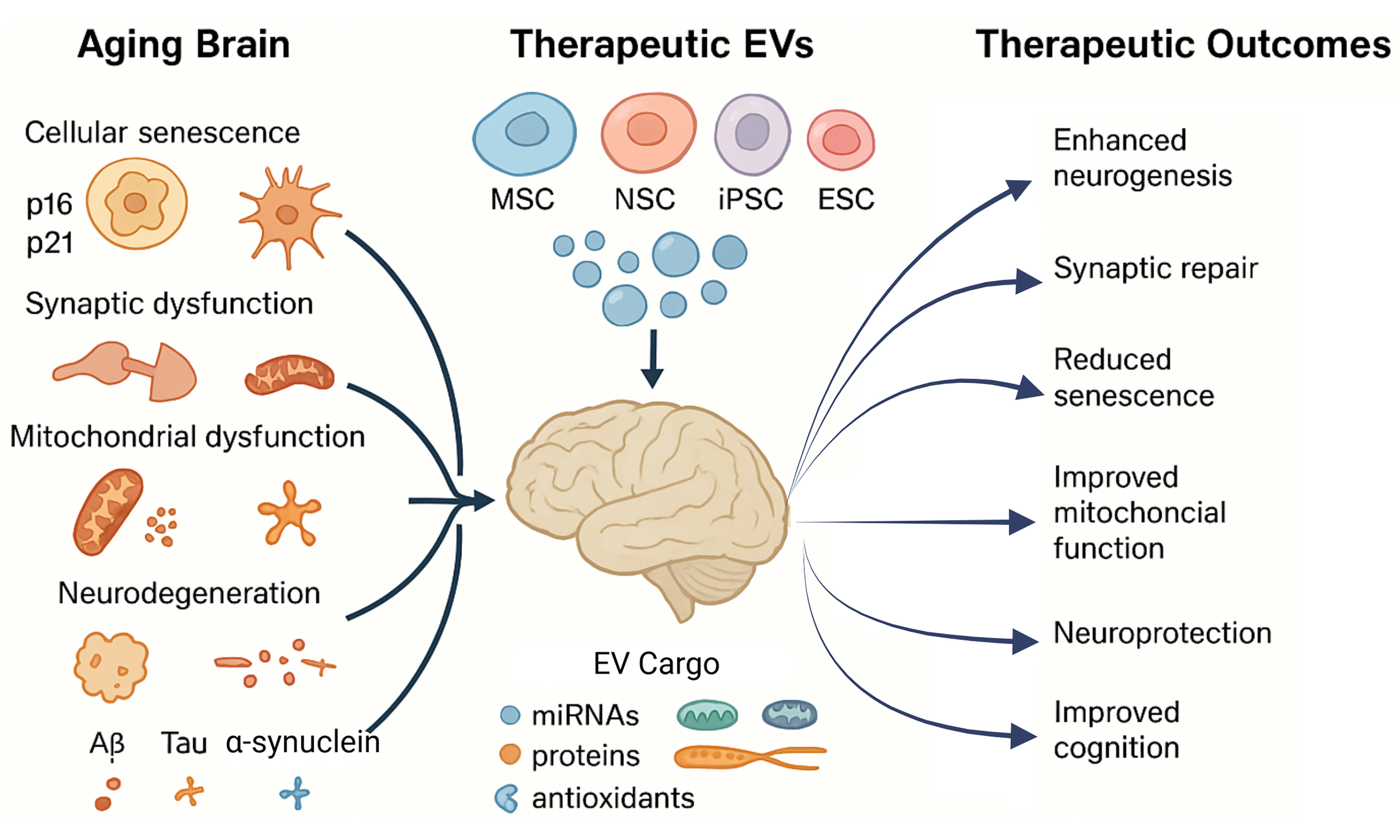 Figure 1. Schematic representation of therapeutic intervention by stem cell-derived EVs in Aging. Aging triggers cellular senescence, neuroinflammation, and synaptic dysfunction, driving cognitive decline and contributing to Alzheimer’s and Parkinson’s disease pathology. Stem cell-derived extracellular vesicles carry antioxidants, neuroprotective microRNAs, mitochondrial regulators, and anti-inflammatory molecules. These vesicles enhance neurogenesis, protect against neurotoxicity, alleviate oxidative stress and inflammation, and improve cognitive function. (Created in BioRender. https://BioRender.com/u7czgbc). EVs: Extracellular vesicles; MSC: mesenchymal stem cell; iPSC-NSCs: induced pluripotent stem cell-derived neural stem cells; hNSCs: human neural stem cells; hADSCs: human adipose-derived stem cells; AD: Alzheimer’s disease; PD: Parkinson’s disease.