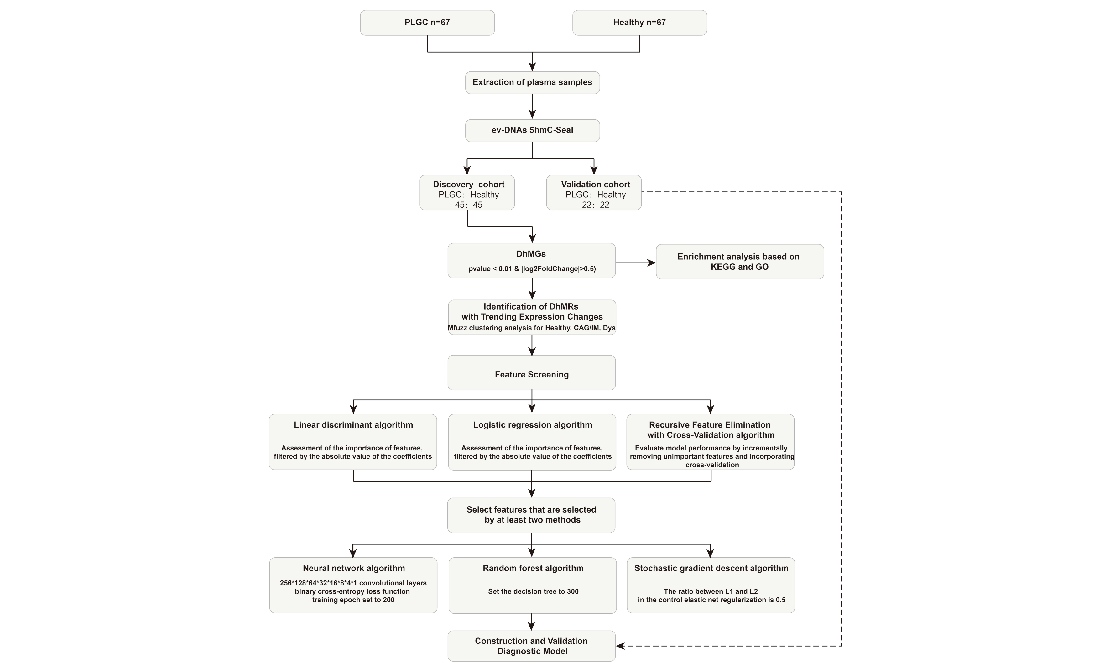 This study utilized plasma evDNAs from patients with PLGC and a matched cohort of healthy individuals with similar gender and age. It also employed the whole-genome 5hmC-Seal technology for evDNAs, which our team developed and optimized for clinical plasma samples. The objective was to clarify the distribution of 5hmC in the PLGC genome, investigate the characteristics of 5hmC-enriched regions, identify genes with differential 5hmC modifications between PLGC and healthy individuals as potential biomarkers, and subsequently develop a diagnostic model to facilitate non-invasive detection of PLGC.